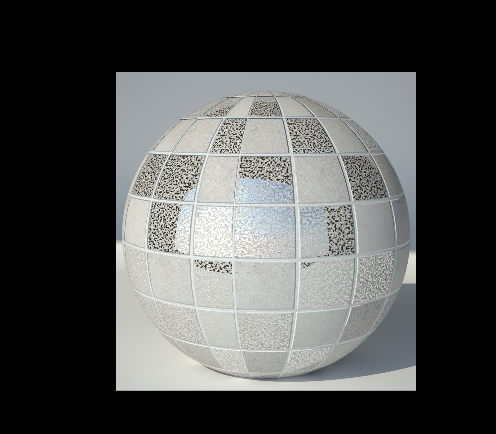 In ogni modo per riprodurre il mosaico in questione non c'è bisogno di stratificare più materiali, puoi fare tutto all'interno di un solo shader aiutandoti semmai con un layered max o anche semplicemente con i due diffuse che puoi mescolare all'occorrenza. Ti allego una prova veloce(avendo tempo si può migliorare molto mappando il glossiness e altro), il displacement lo puoi attivare o disattivare a seconda del dettaglio che cerchi.