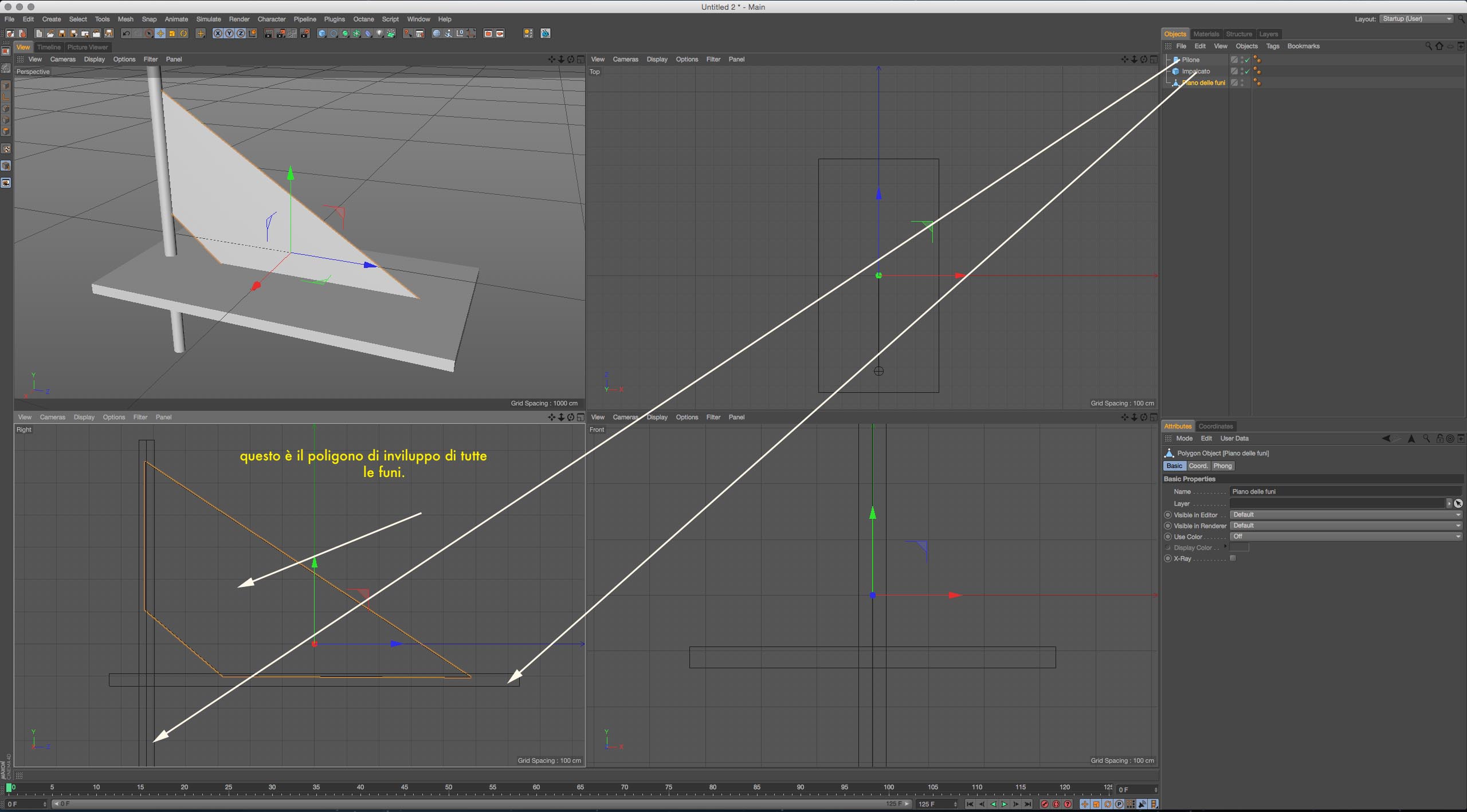 Adesso però ho bisogno del vostro aiuto per non impazzire. Mi hanno commissionato la renderizzazione di un ponte, che non esiste perché è ancora in fase progettuale, il mio problema è come realizzare in modo semplice tutte le funi di sostegno. Perchè tali funi partono da dei punti distribuiti sul piano orizzontale e convergono tutte su dei punti situali all'inizio del ponte.
