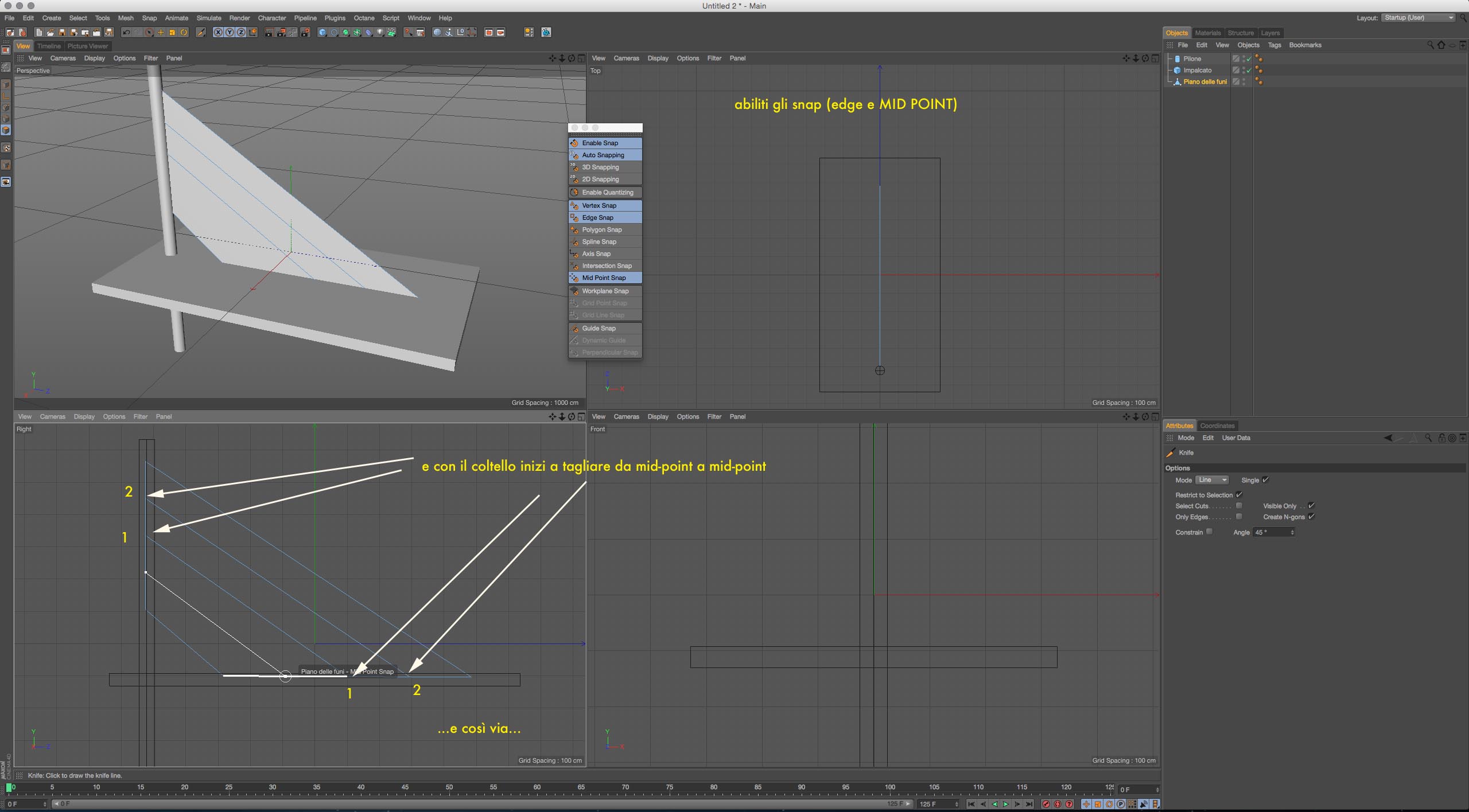 Se invece gli stralli devono essere distribuiti anche in verticale lungo il pilone allora potrebbe essere utile il metodo "toscano" usando un poligono suddiviso ma con la variante di usare il taglio multiplo (in mod. lato) selezionando i due lati da suddividere togliendo la spunta dal crea n-angoli; in questo modo in un colpo solo ottieni il poligono tagliato con i lati pronti per essere trasformati in spline con apposito comando! ;)