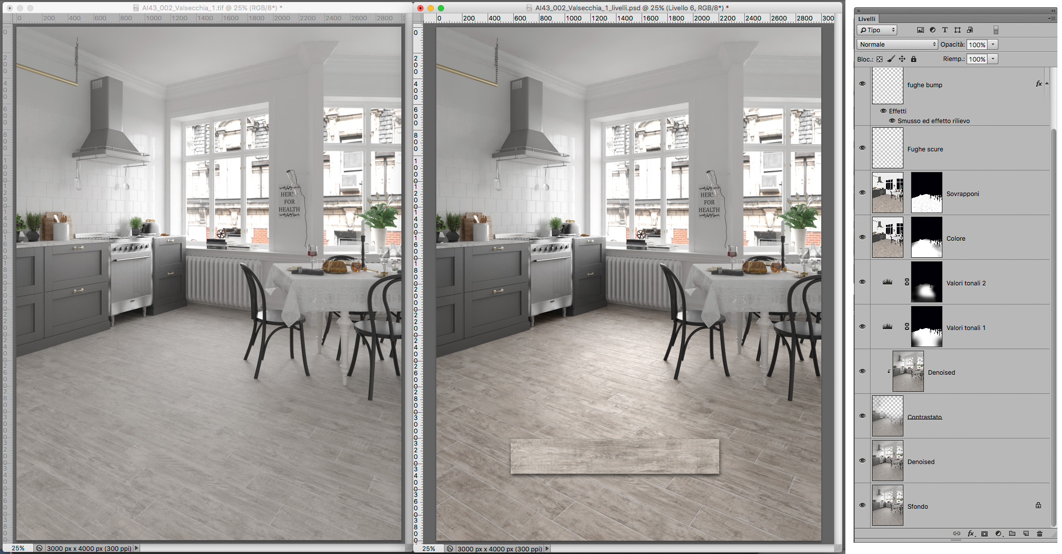 Arrivo al dunque. Qui ho accostato due immagini, la prima è quella che è uscita dal render, la seconda quella che ho corretto lavorando ore con Photoshop per ricostruire texture, fughe in rilievo, contrasto, luci, ombre…