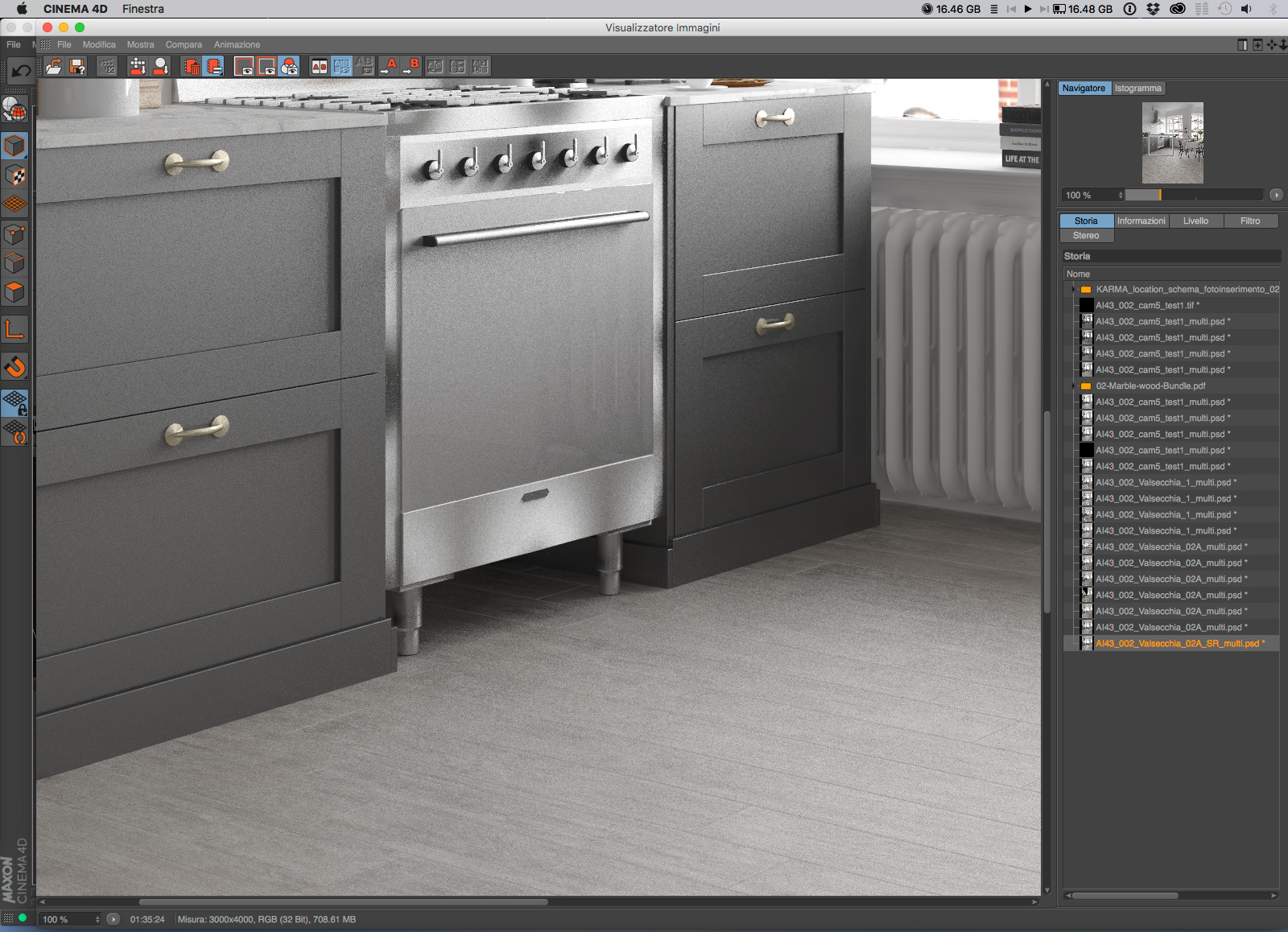 C4D finora l'ho usato al 90% per altri tipi di lavori, ad esempio progetti di espositori, box e sale mostra, sempre per le ceramiche, lavori più tecnici che non hanno mai richiesto il fotorealismo. Anni fa ho acquistato Vray ma in pratica l'ho usato per un solo lavoro, render di macchine industriali, mai per ambienti. Per diversi motivi: con la versione 1.2.6 era quasi impossibile ottenere precise maschere di scontorno (oggi buffer) che sono assolutamente necessarie per gli ambienti ceramici, e anche i materiali che inserivo non erano per niente simili agli originali, così ho smesso. Con la 1.8 è stato aggiunto il Multipass, benissimo, ma per creare un ambiente ex-novo ci voleva troppo tempo, e i clienti vogliono spendere poco. Inoltre avevo sempre il problema dei materiali, che risultavano troppo diversi da quelli veri. Smesso di nuovo.