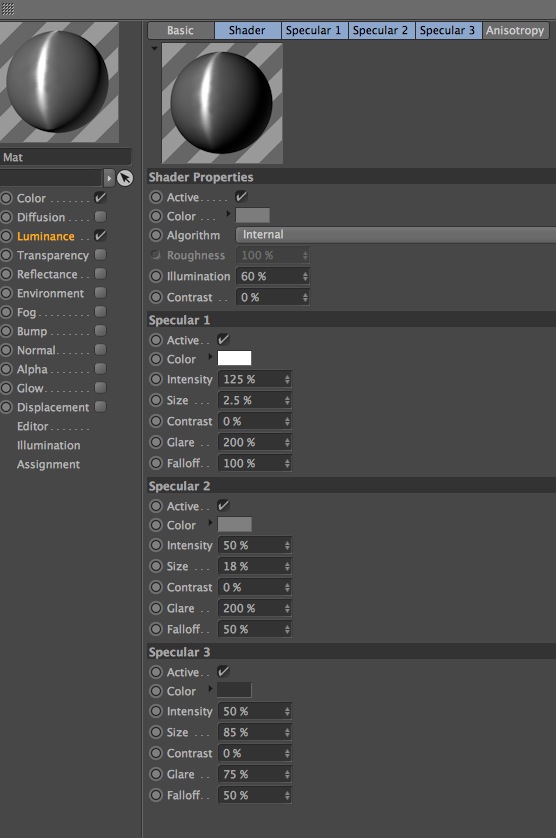 Io lavoro su una versione R15 di Cinema 4D e ho notato che, utilizzando materiali scaricati o gli stessi materiali inclusi nel programma dal menù "Shader", è possibile lavorare con canali aggiuntivi.