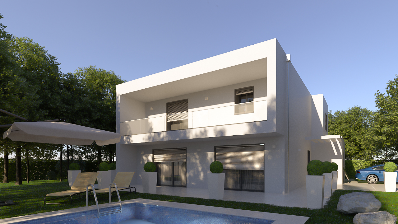 Quella di notte sarebbe anche interessante, ma quello che mi lascia perplesso è l'eccessivo effetto dei faretti alle pareti. Mi sembra che sparino un po' troppo. Magari cambiando tipo di effetto e mettendo qualche luce nel prato lungo il marciapiede.....