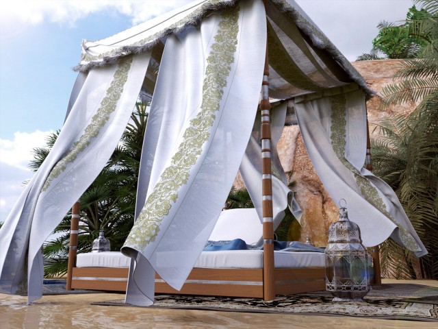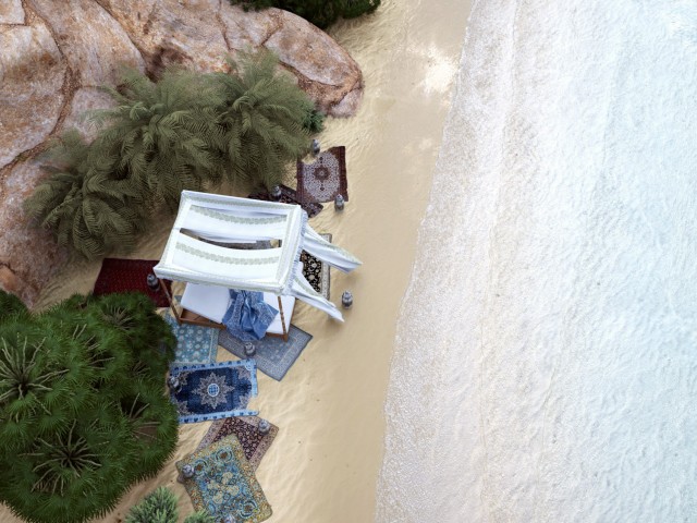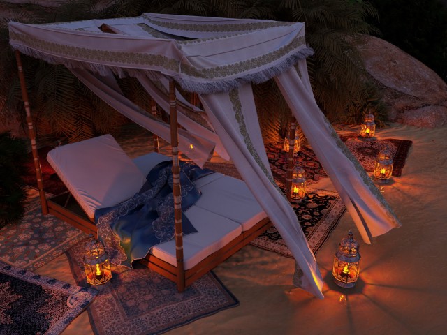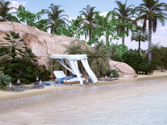 Per quanto riguarda la giornata, come da titolo, non è soleggiata ma "senza sole" ed il cielo non è limpido ma nuvoloso ( hdri con nuvole sul sole ). Le ombre sono quindi molto diffuse. Volevo un'atmosfera diversa da quella solita soleggiata. I tappeti sono messi apposta per non toccare la sabbia, comunque sono molto più scenici che funzionali ;)