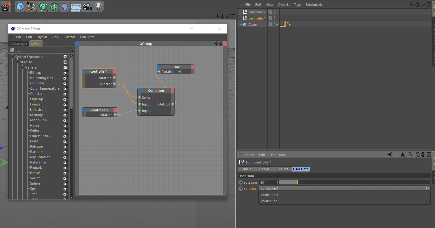 I have a difficult question: How can i drive from two control objects with its user datas a third one through Xpresso?