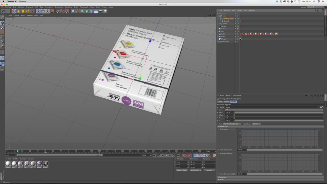 Come vedete ho creato un tramite un cubo, un parallelepipedo alto solo 0.5cm e lungo quanto il perimetro del packaging, poi lo wrappato tramite il comando "avvolgi spline" intorno allo stesso.