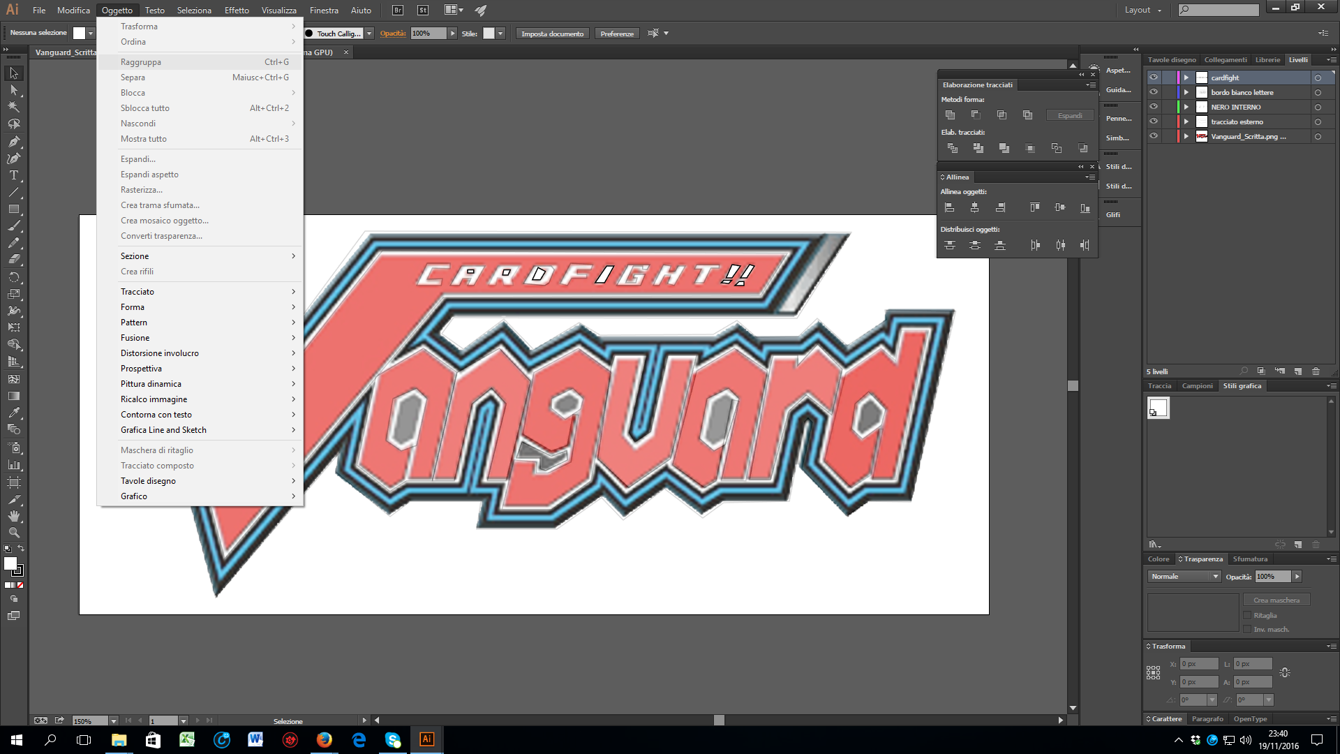 Ma questa è un'altra storia. Veniamo a QUESTO problema. In sintesi, ho ricreato il tracciato di un logo SU PIU' LIVELLI. Ora io non so se questo, nel mio specifico caso sia il modo più giusto per lavorare questo tipo i loghi (dato che uso Illustrator da una settimana scarsa), però volevo capire se c'era un modo per raggruppare i tracciati dato che l'opzione "Oggetto > Raggruppa" NON ERA DISPONIBILE.