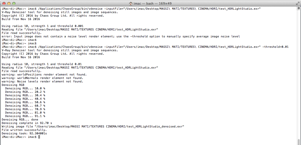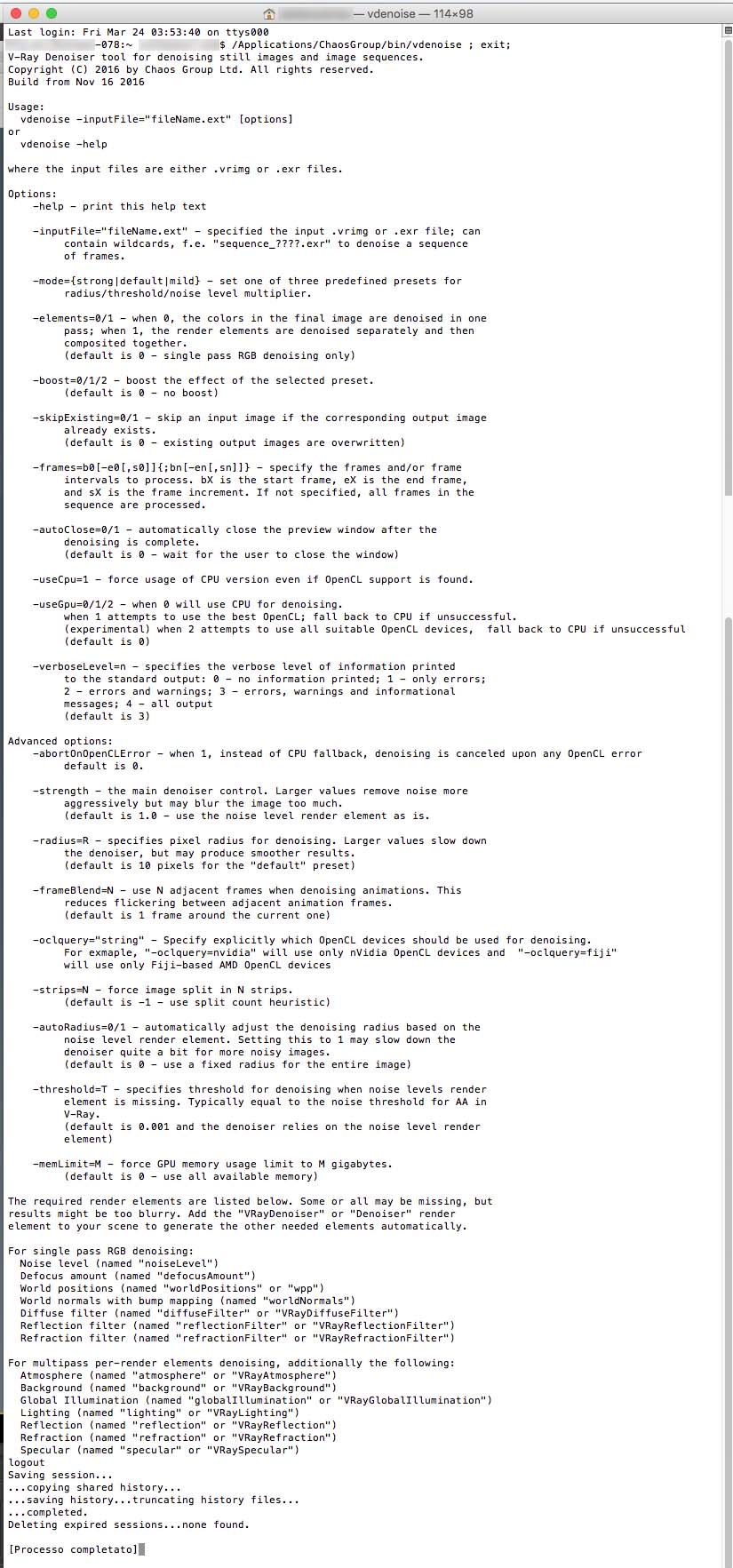 Questo è il contenuto del terminale una volta che lancio il denoiser: una volta lanciato pur seguendo le indicazioni trovate quì: https://docs.chaosgroup.com/display/VRA ... C+vdenoise non riesco ad ottenere alcun risultato.