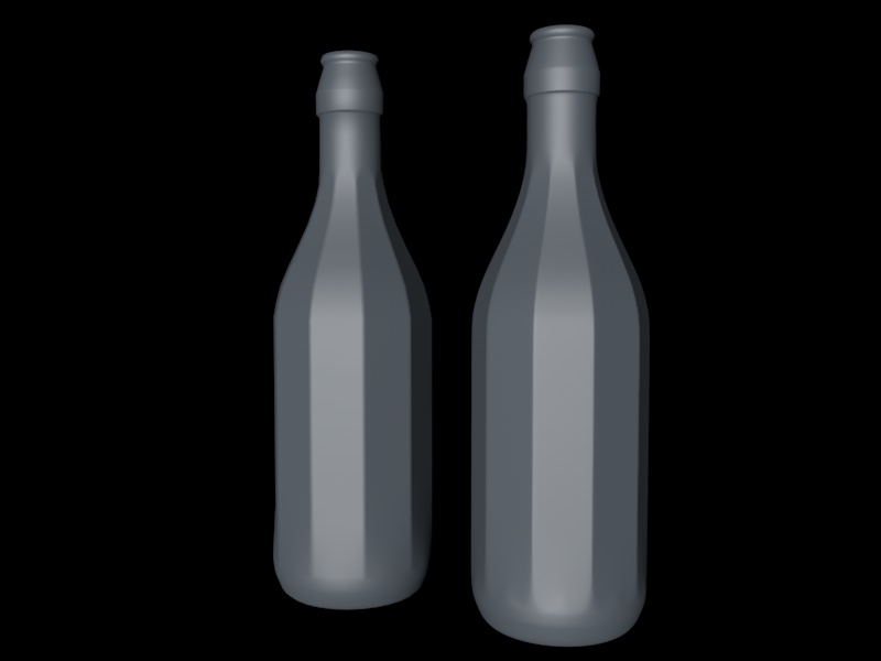Ho modellato a parte il collo, il centro e il fondo della bottiglia con valori di rotazione diversi (50, 10, 50), eliminato il resto e lasciato solo uno dei 10 lati di cui è formata la bottiglia, unito in un'unica superficie le tre parti, muovendo i punti interessati in modo da avere la parte superiore ed inferiore arrotondata, tirato i punti qui e là e, infine, ruotato delle copie e il risultato è quello che vedete nelle immagini... Si avvicina al risultato ma conserva delle "giunzioni" che non vanno bene e gli spigoli sono troppo netti...