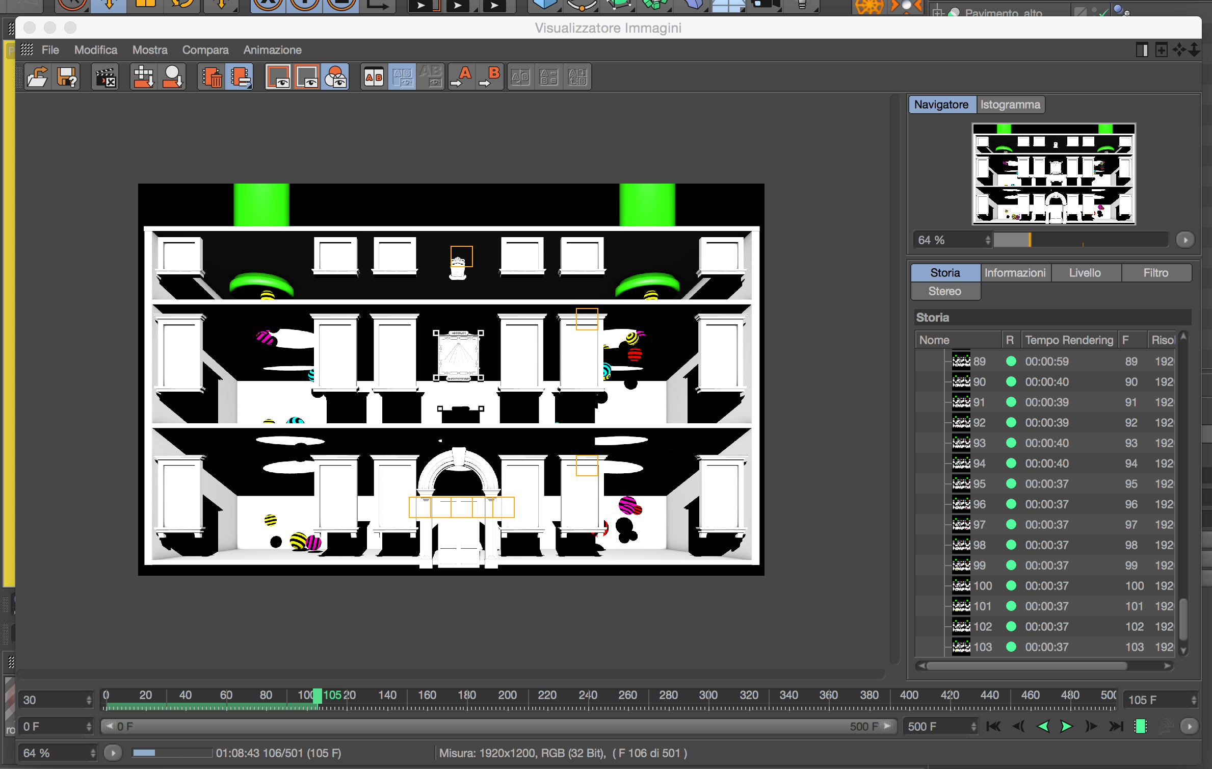 L'animazione nella viewport di cinema è completa però quando renderizzo non lo fa. Allego 2 img nelle quali si vede la differenza al fotogramma 105. Chiaramente nella viewport è corretta, nel visualizzatore immagini no.Ho controllato tutti i parametri dell' ''emettitore particellare'' di inizio e fine