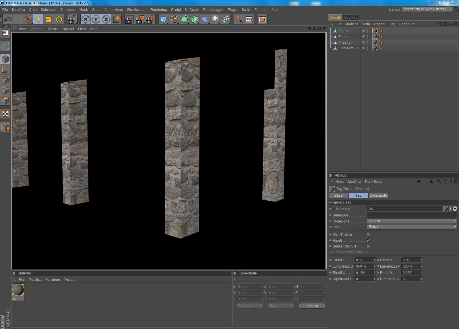 Ciao a tutti! Ho un problema con la mappatura: ogni faccia del pilastro non è la continuazione dell'altra, ma la texture parte sempre dall'inizio...Ho creato il disegno in Allplan e poi l'ho importato in C4d...se invece creo un cubo ed applico la texture, nessun problema!