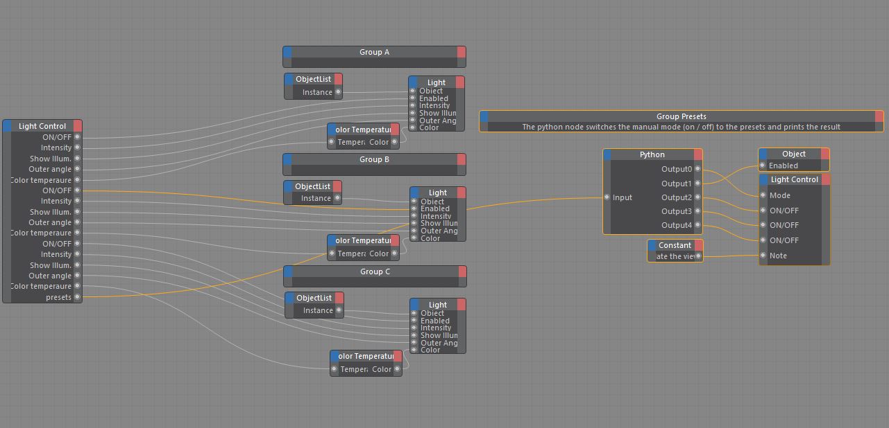 Finora mi sono sempre arrangiato raggruppando le varie luci in modo tale da accenderle e spegnerle all'occorrenza dall'object manager, anche di questo allego immagine del mio attuale setup: