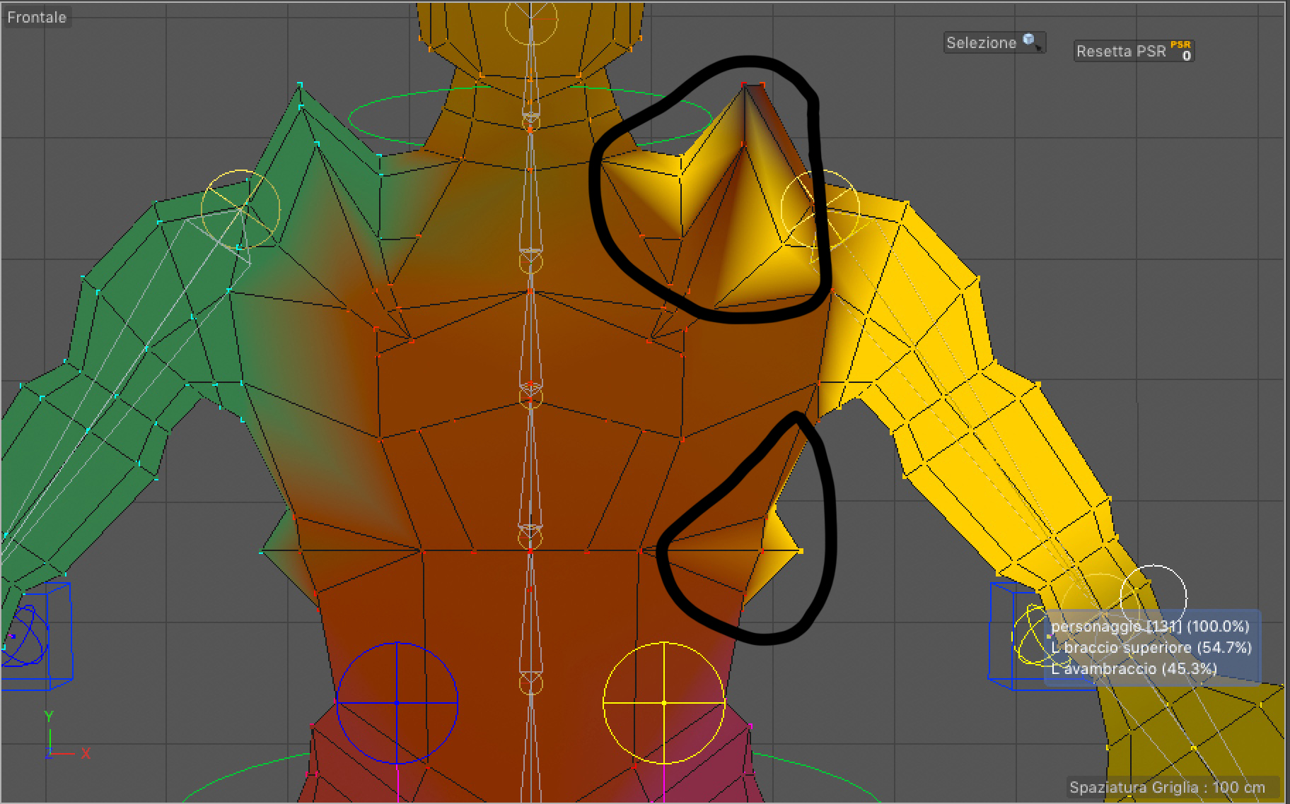 Sono partito dalla pesatura automatica per verificare il comportamento del personaggio rigato con l'intento di correggerlo manualmente ma come già detto non riesco modificarne il peso.