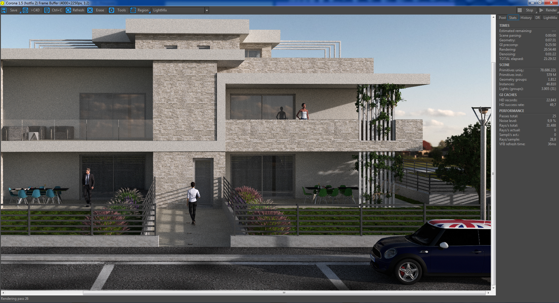 Corona 1.5 hotfix 2 ------ render di 4000x2250 px .... tempo di rendering 20 ore per 26 pass ed un noise di 10??!!??!!?