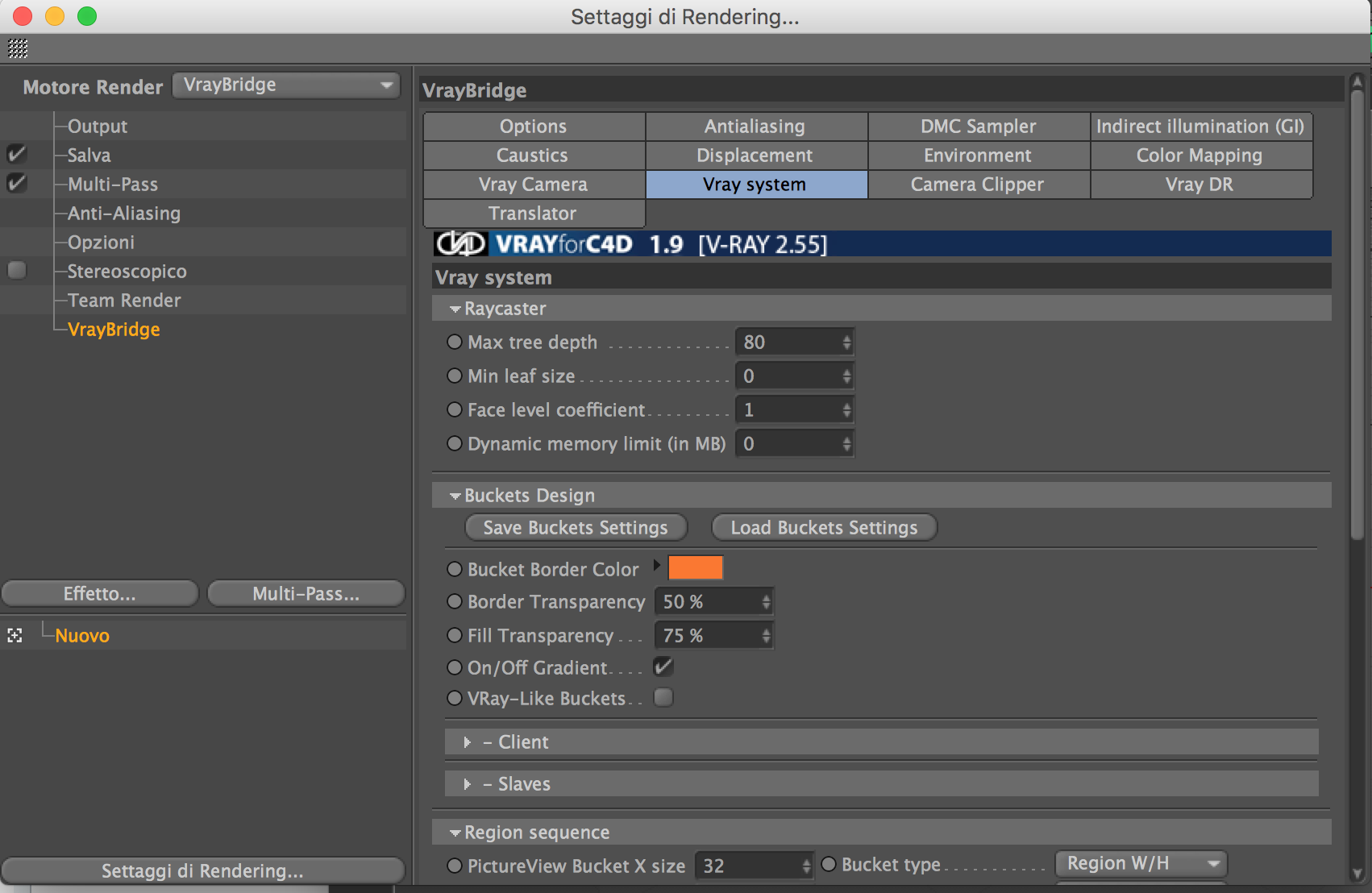 Ricorda poi ti attivare il multipass di cinema, aggiungere immagine RGBA e Post Effetti, per un riversamento corretto di vray nel multipass di cinema4D e poi nei parametri progetto (menu modifica > parametri progetto) togli il Workflow lineare, altrimenti cinema applicherà il suo due volte.