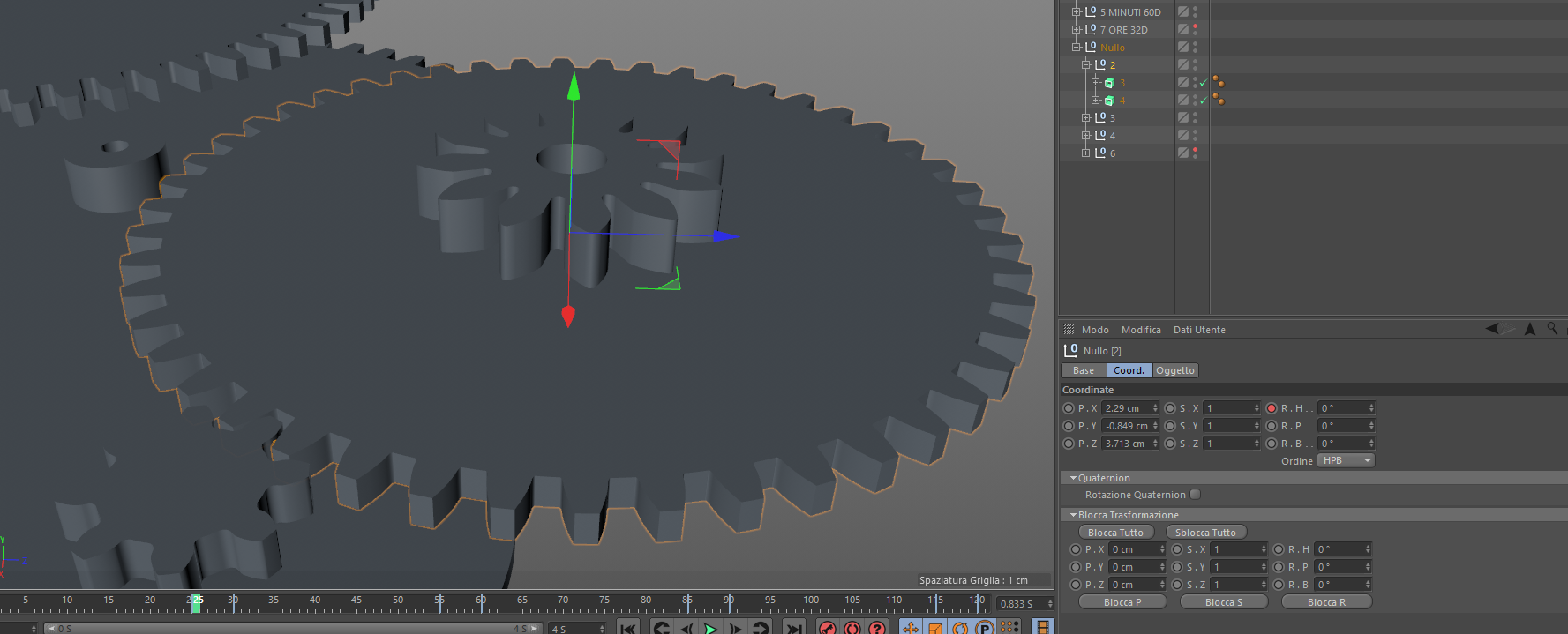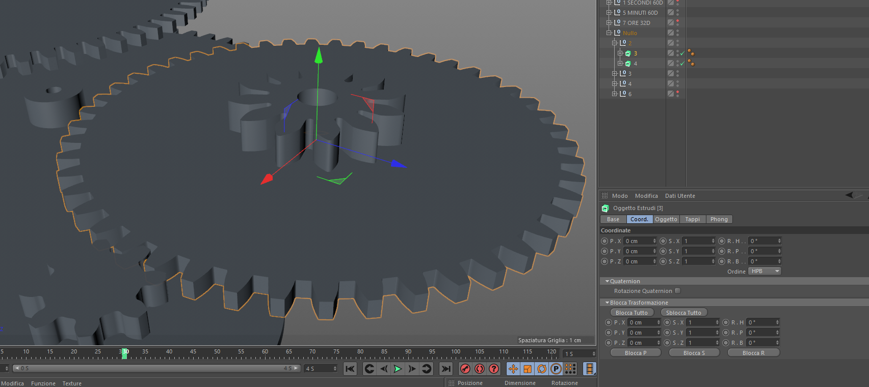 ho un oggetto nullo a cui applico una rotazione di x gradi ogni tot tempo, per intenderci l'oggetto nullo che nelle immagini si chiama 2, questo a sua volta ha due figli estrusi a cui non è stata applicata nessuna animazione nel tempo, il figlio(quello estruso) chiamato 3 segue correttamente la rotazione del genitore, mentre il 4 no, ho provato a cambiare l'ordine ma non cambia nulla, gli assi sono allineati, non so quale sia il problema.