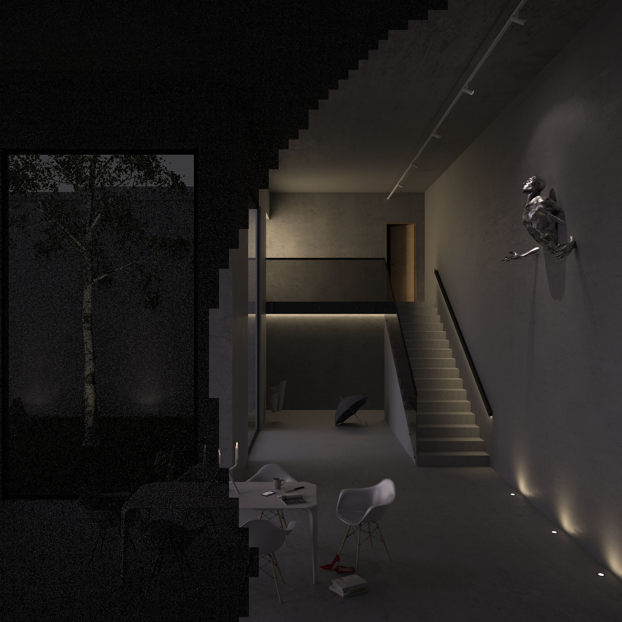 Vi allego una bozza della scena che sto realizzando. Idealmente vorrei che ci fosse l' effetto bagnato "a chiazze"nella zona dove è posizionato l' ombrello. Mi piacerebbe anche che quest'ultimo risultasse bagnato. So che questo tipo di effetti si ottengono con le mappe di riflessione ma nella pratica è la prima volta che provo a creare questo effetto. Le grandi vetrate che danno sull'esterno le volevo post produrre in photoshop mettendo delle goccie d' acqua sul vetro.