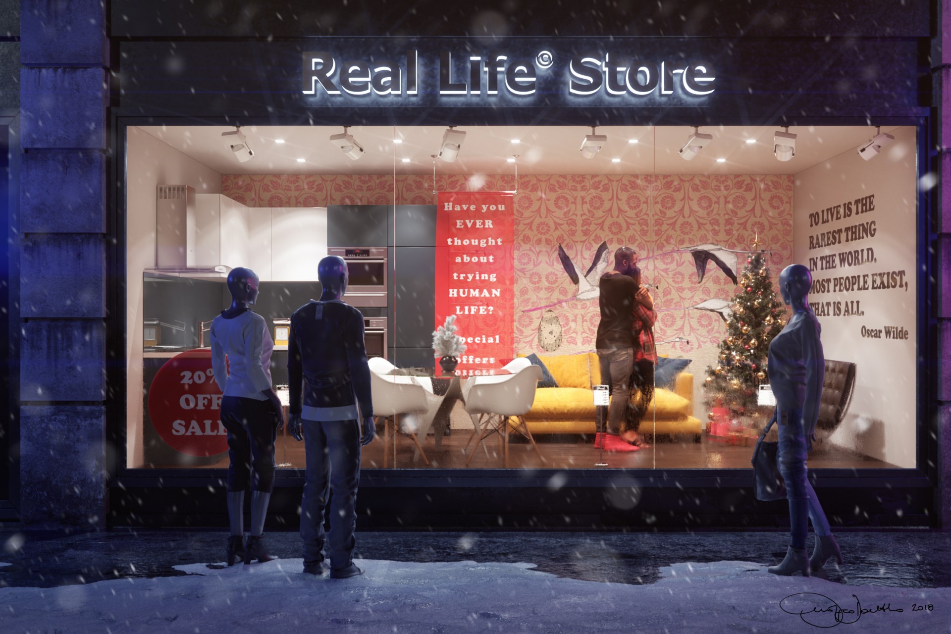 Nelle mie intenzioni c’era quella di costruire una sorta di immagine allegorica, da interpretarsi come un invito a vivere, rappresentato da una vetrina, in cui attraverso simbolismi più o meno espliciti come i manichini, le cicogne, l’albero di natale, la citazione, ho voluto contrapporre il freddo di una vita sintetica, “non vissuta”, al calore di una vita reale, sintetizzata in un abbraccio.