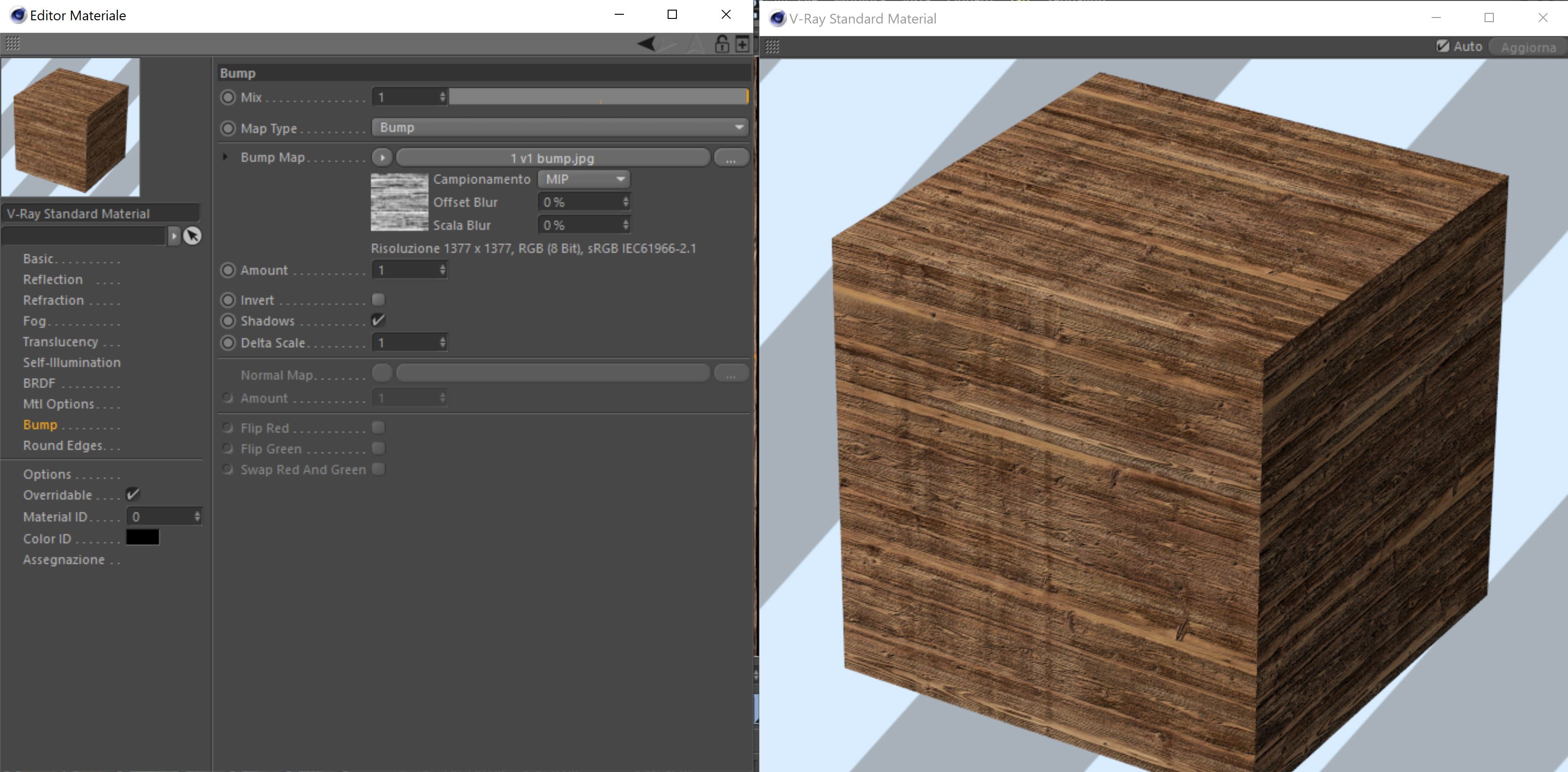 Vi posto lo screen dello stello materiale, creato con le stesse texture orientate sia la diffuse che la bump in orizzontale, ma una volta con creandolo come Standard Material e una volta creandolo come Advanced Material: