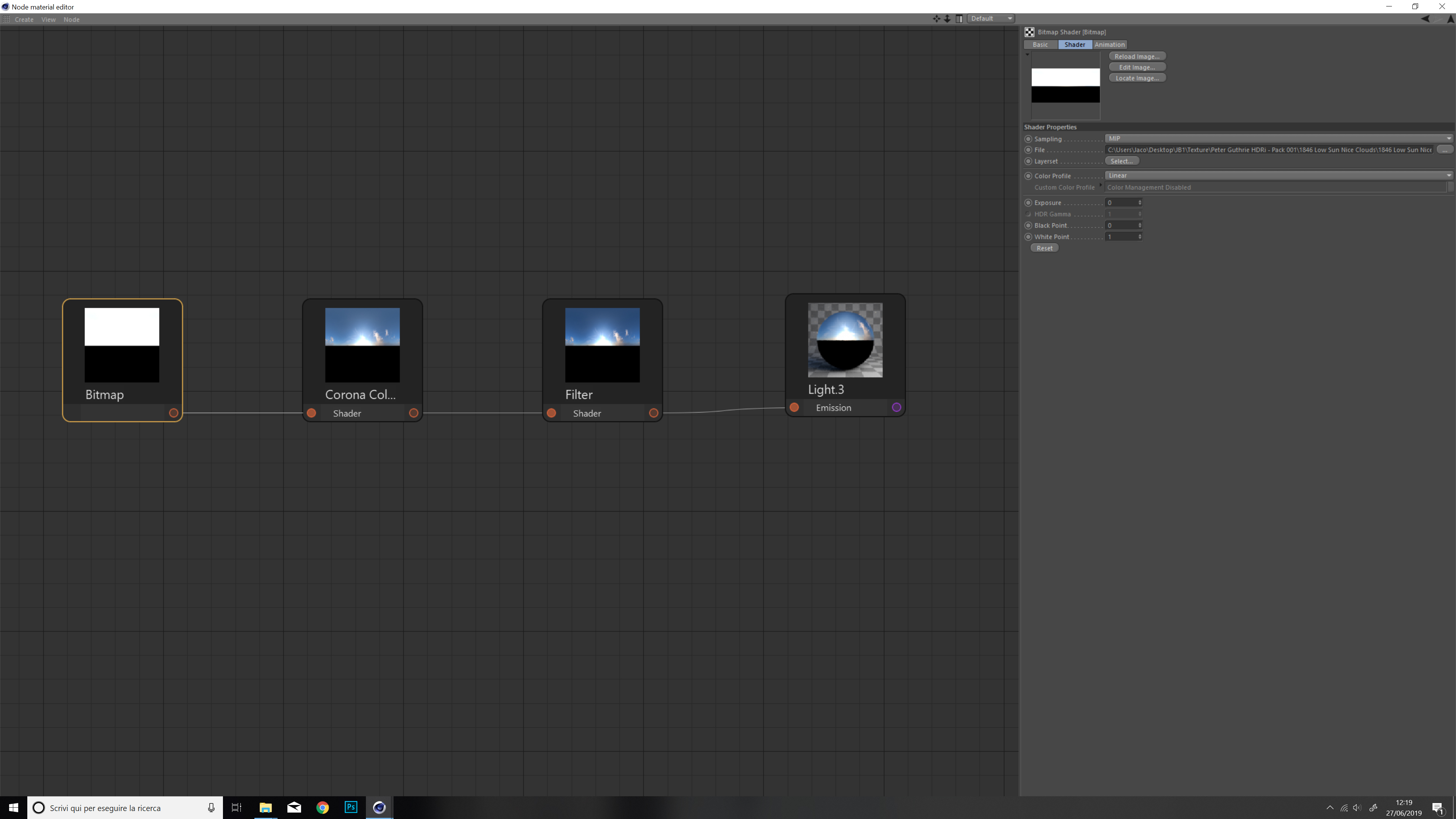 Inizialmente applicavo una bitmap con l'hdri ad un corona color correction per cambiare l'esposizione a -4.3 e poi successivamente applicavo un filtro di c4d per cambiare la gamma.