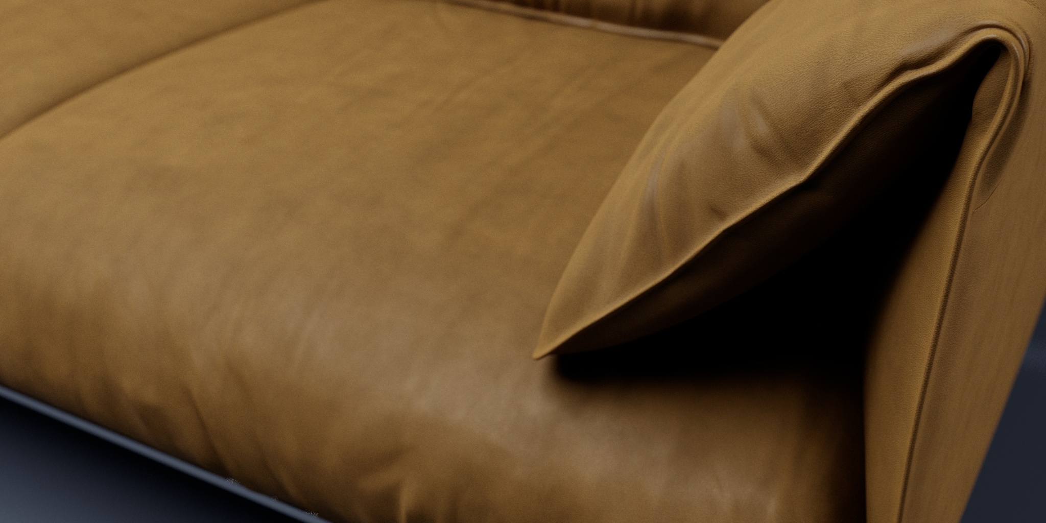Torniamo ai materiali, sotto suggerimento di un'utente stamattina ho creato questa pelle all'anilina invecchiata, allego la poltrona di riferimento e il materiale applicato su un divano, in più un particolare dello shader calcolato sul mio set virtuale: