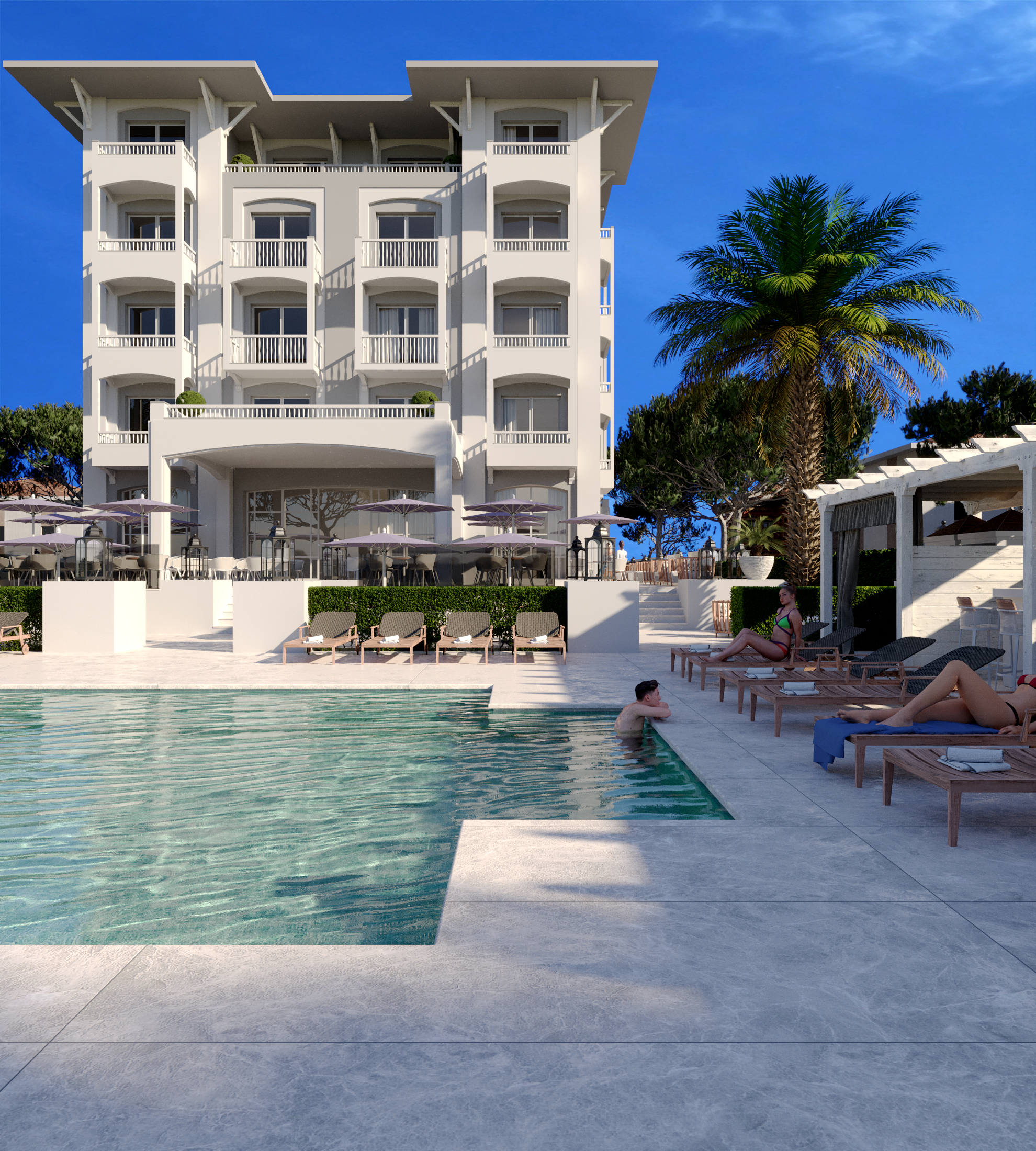 si tratta di un hotel con piscina,involucro edilizio costruito in Vectorworks tutto il resto in C4D,illuminazione con HDRI.