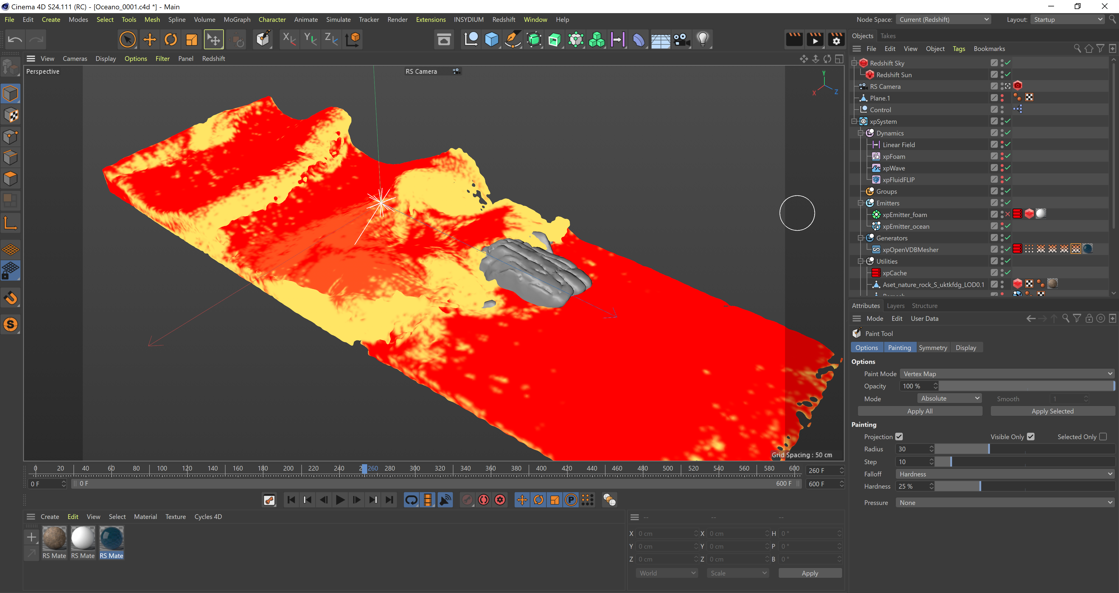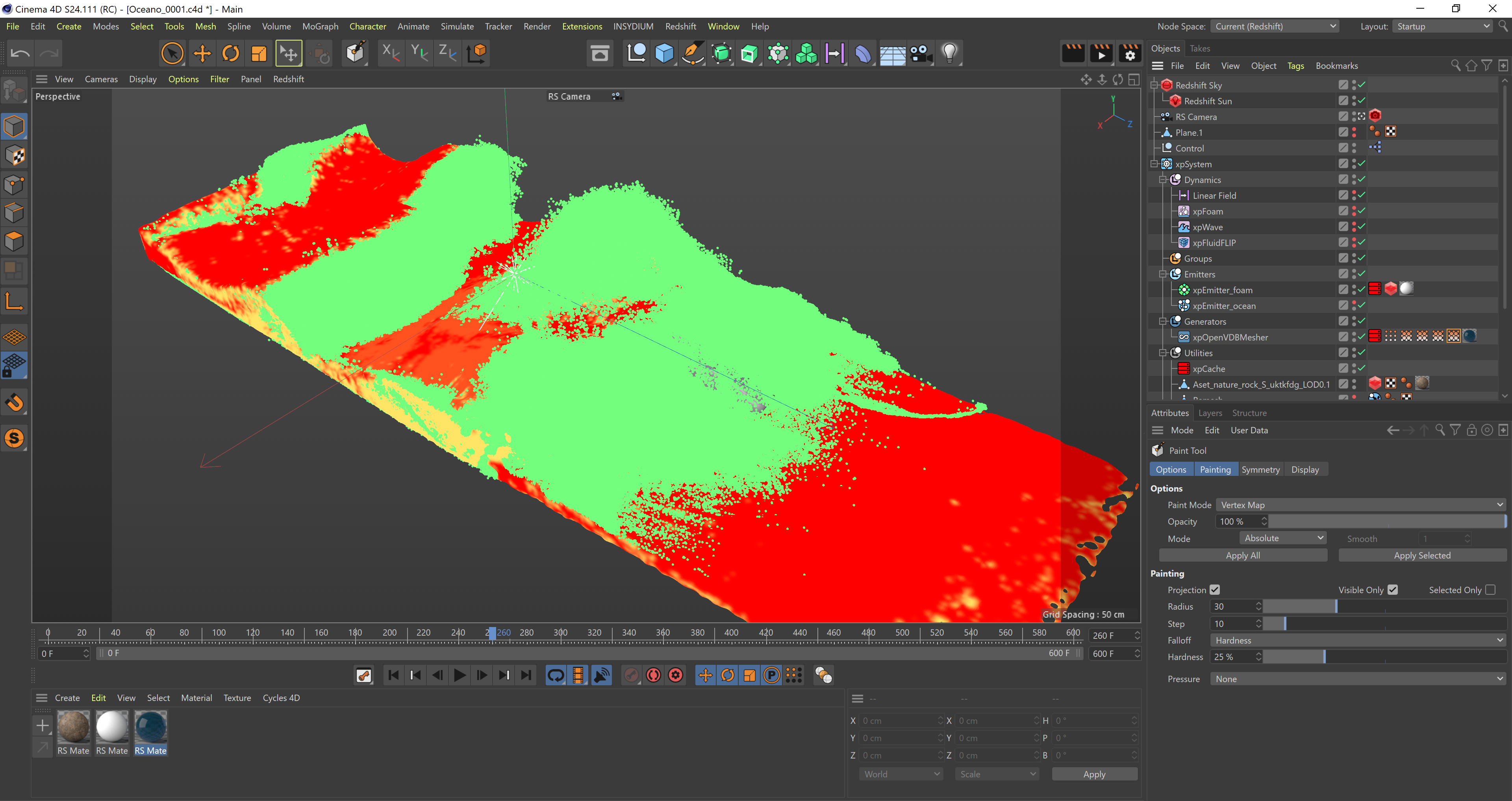 -Con il nuovo OVDBMesher che permette di generare delle vertex map a contatto con le particelle ho cercato di creare varie tonalità del mare in prossimità della schiuma.