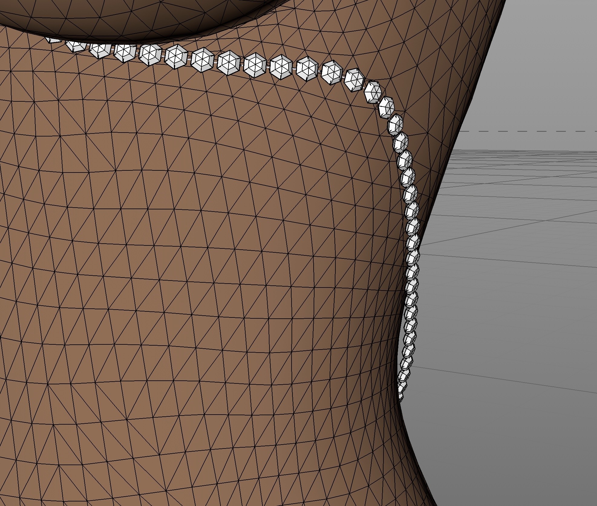 Sto realizzando una collana che deve seguire il body, quindi ho prima creato la spline e su questa sto inserendo come cloni le pietre.