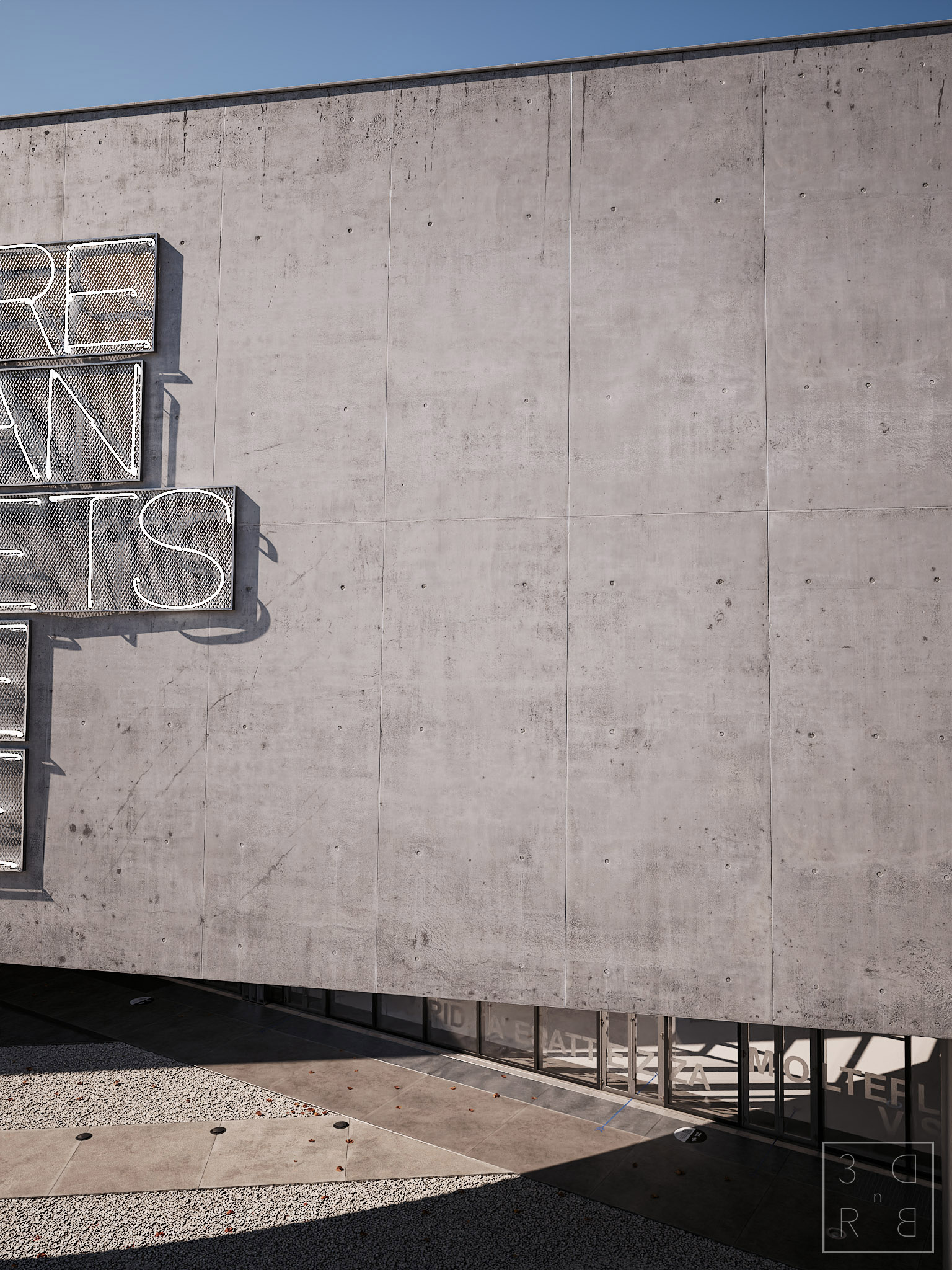 Stessa inquadratura con luce diurna e dettaglio sulla facciata in cemento: