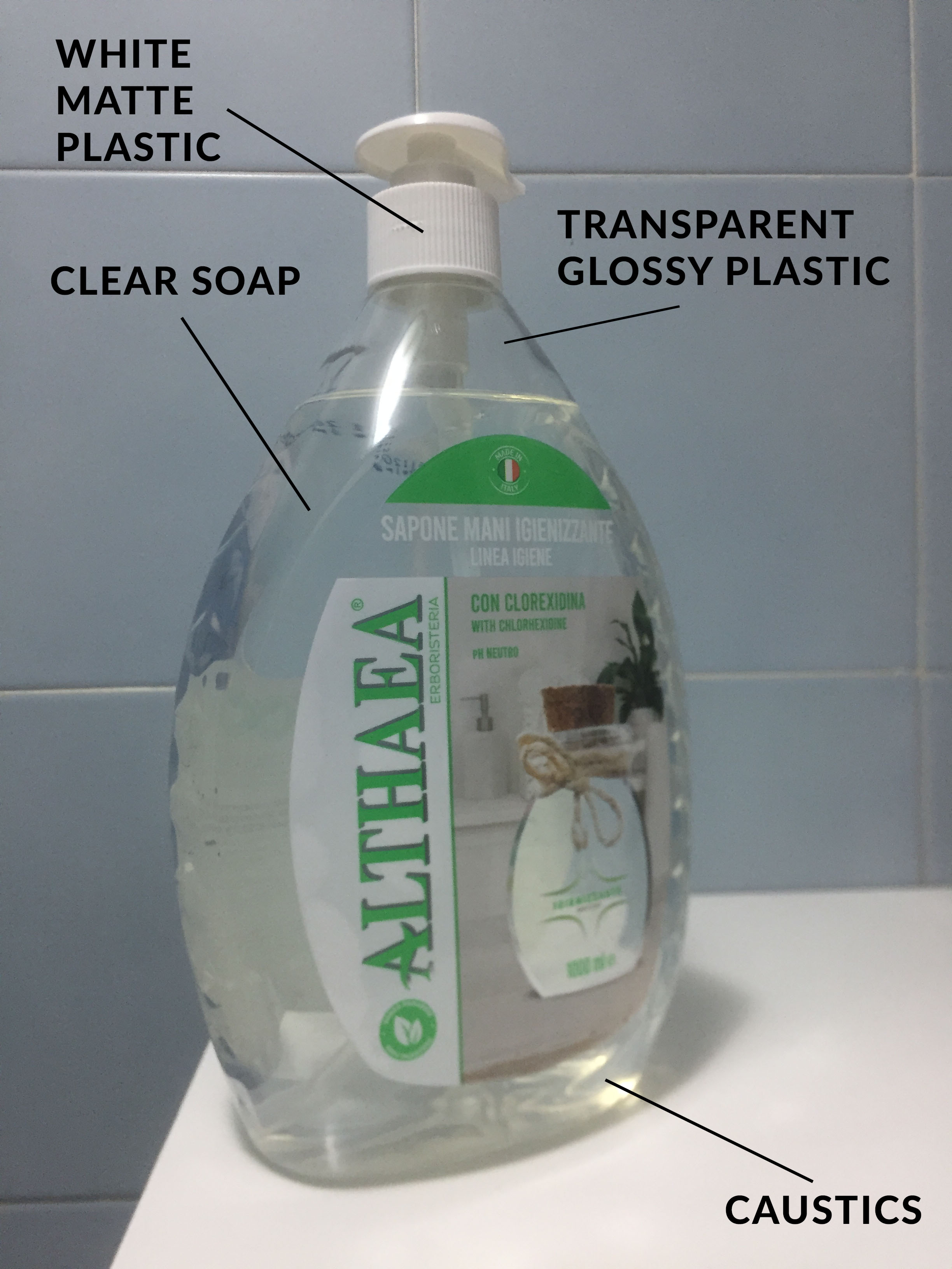 Giusto per un quadro più completo posto a seguire due scatti con telefonino della bottiglia reale del sapone igienizzante.
