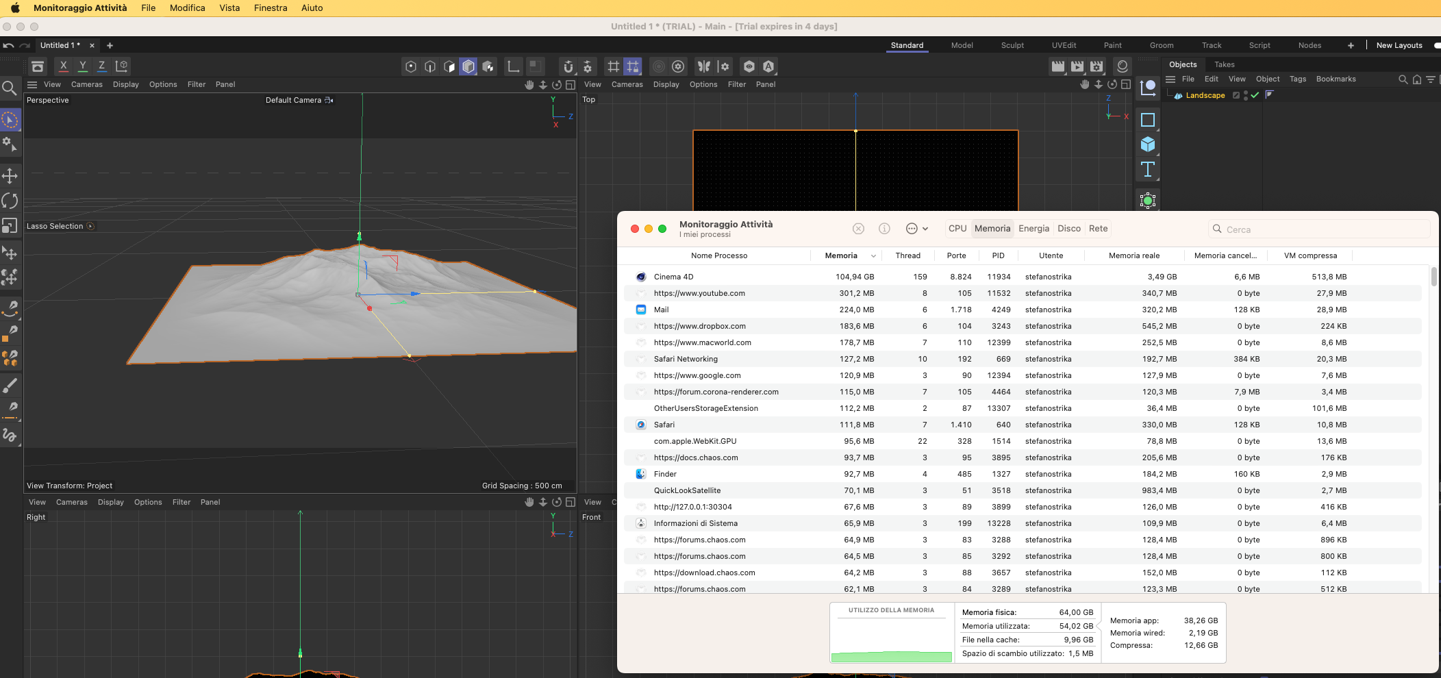 Per verificare che la memoria non fosse realmente saturata ho aperto una scena (con fur, displacement, verde ecc) e come vedi l’ha calcolata senza problemi, portando la “memoria reale” a 24GB che si sono andati a sommare agli altri portando la voce “memoria” a oltre 130GB.
