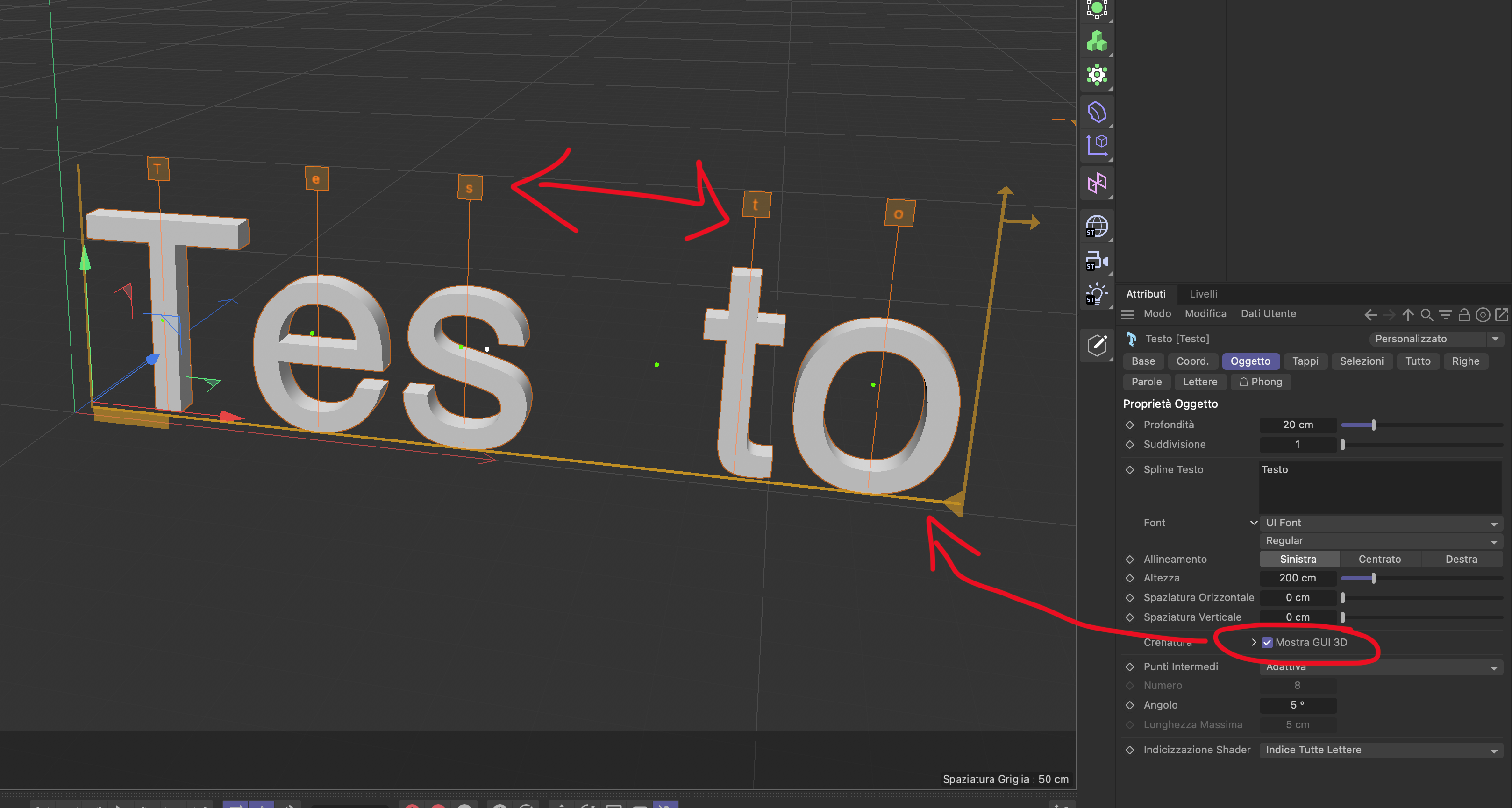 Ciao Master, grazie mille per la risposta! Ho provato però, come si vede dallo screen che allego, le lettere non seguono il binario e si spostano in linea retta in base alla loro posizione. C'è un modo per correggere questa cosa?masterzone wrote: ↑Thu Feb 09, 2023 8:25 am Ciao! si se vuoi puoi attivare nello strumento testo 3D, la GUI3D che ti permette di modificare tramite le stanghette la spaziatura del testo...