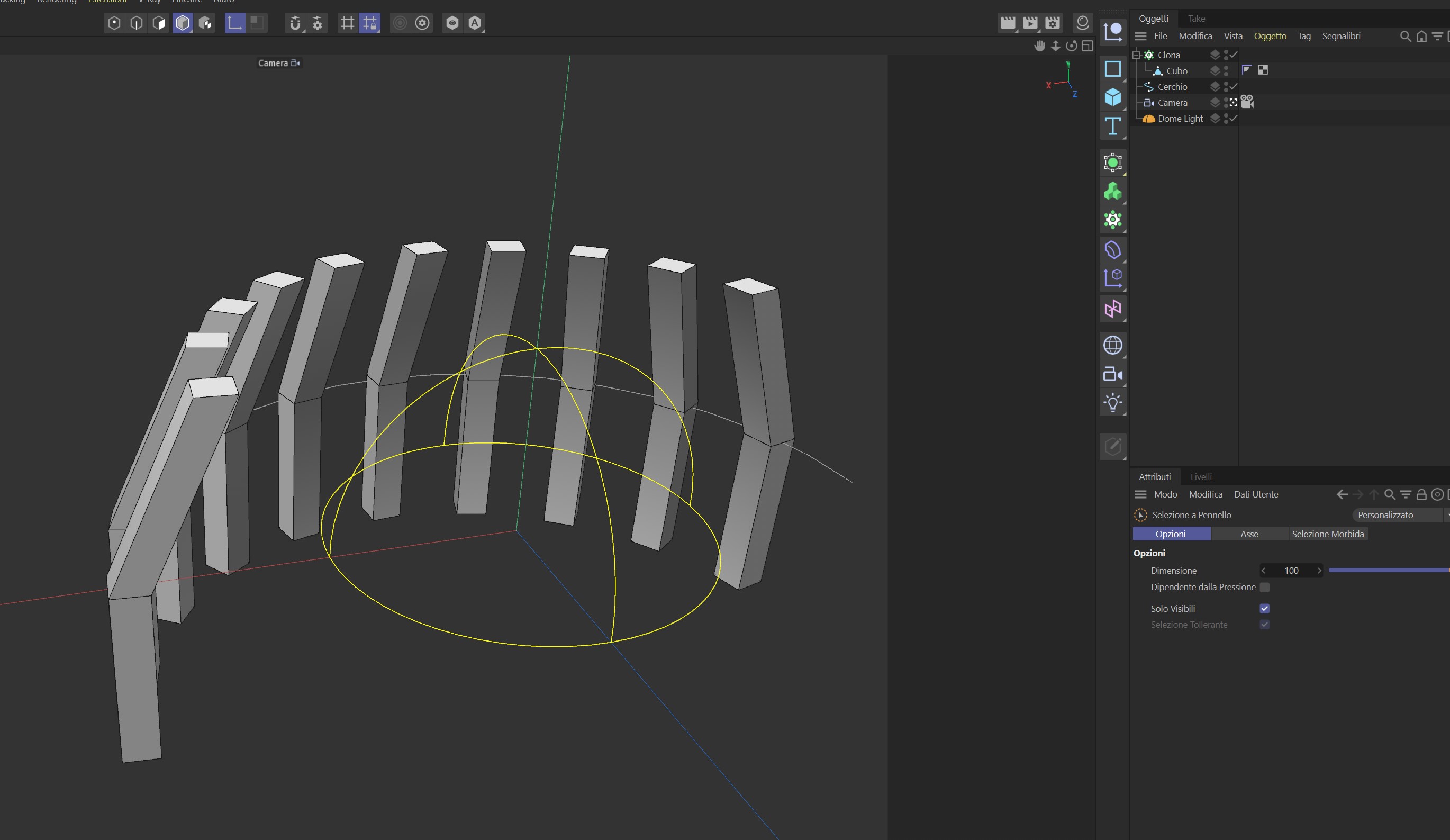 Come devo fare ? E' corretto Clona ? Ho provato con "copia" e riuscivo asd ottenere il percorso lungo la spline/arco, ma non ottenevo la rotazione degli elementi rivolti verso il centro.