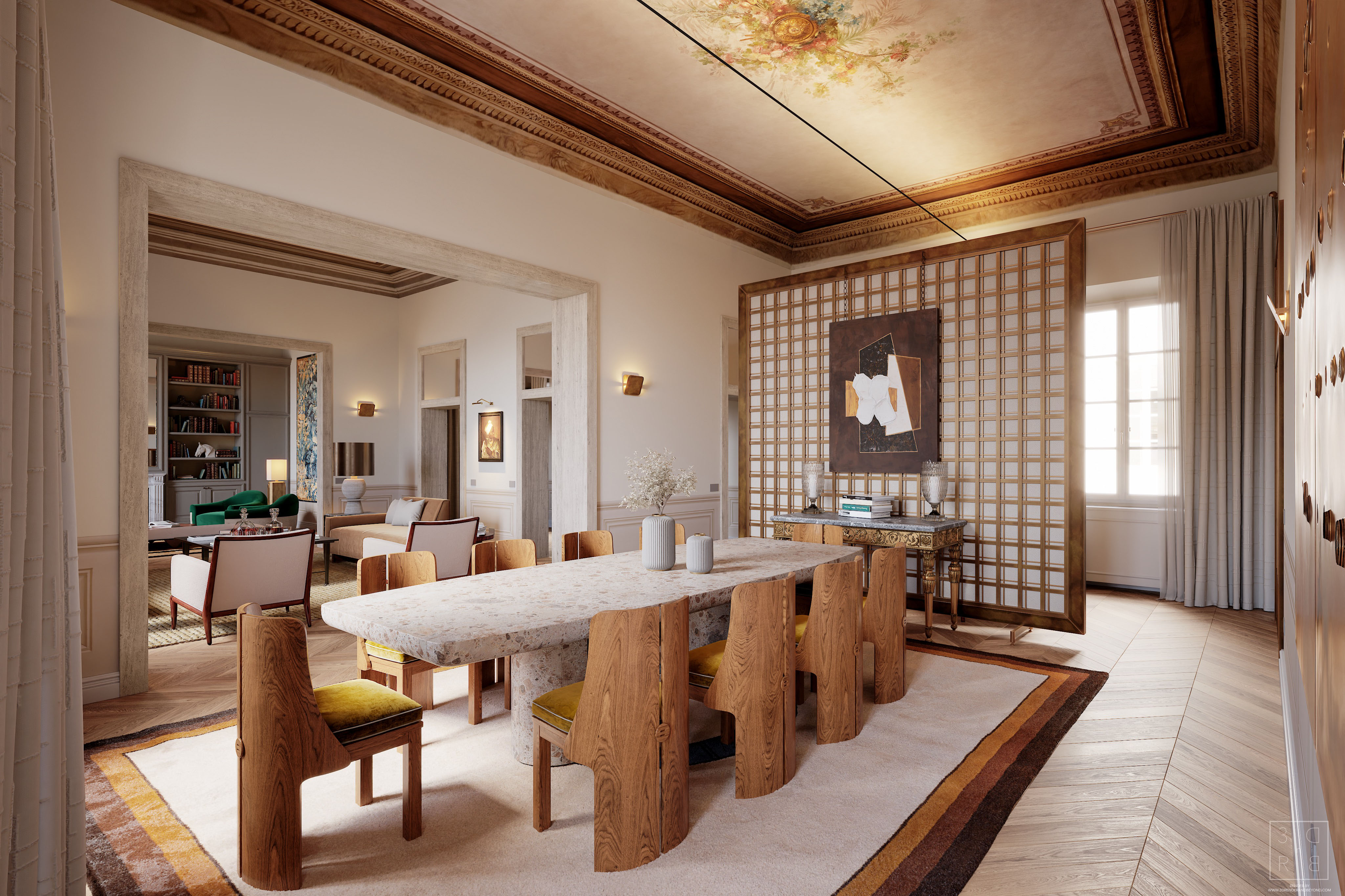 Ho realizzato i render di vari ambienti tra cui libreria, sala da pranzo e salone, ingresso, due camere da letto, cucina e terrazza.
