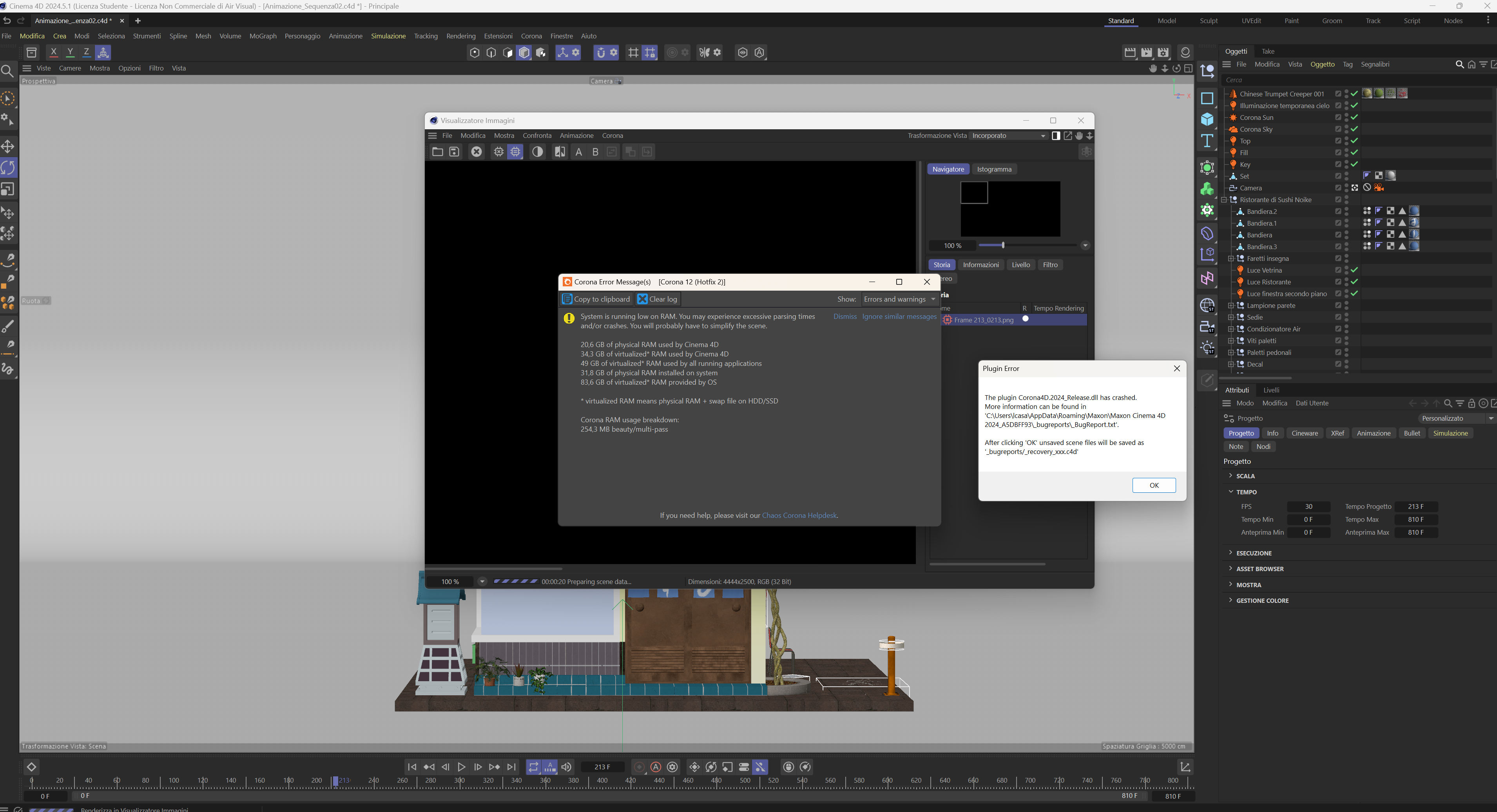 Salve, vi contatto in quanto mi occorre risolvere un problema che ho riscontrato lanciando un render con Corona (ultima versione ad oggi) su Cinema 4d 2024.5.1 (Licenza studente) E' un progetto di tesi e consiste in un'animazione. Il problema non so da cosa può derivare in quanto ho 32 Gb di Ram, CPU i9 12900K e Scheda grafica GeForce 3090 RTX EVGA. Mi domando se i settaggi che ho sia sul computer che sul motore di render funzionano e sono ottimizzati in quanto non so da che parte farmi, in più, mi domando se c'è qualcosa che posso fare nella scena per riuscire a renderizzare il tutto. in allegato vi allego un link ad una cartella con tutte le texture utilizzate, oltre al messaggio che mi compare. A volte mi compare anche l'allegato nominato "Problema". Mi sapreste aiutare?