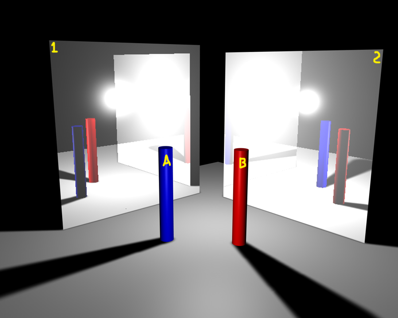 E' possibile fare in modo che gli oggetti A e B si riflettano entrambi nello specchio 1, ma che nello specchio 2 si rifletta solo A o B, senza ricorrere alla postproduzione ?