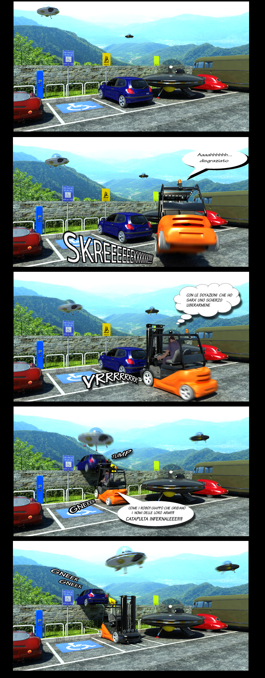 Potresti mettere una vettura che ha parcheggiato nel posto riservato al muletto e quest'ultimo che la sta sollevando per liberarsi il parcheggio ... anche se mi sa che una cosa del genere la dovresti risolvere con due o tre render in stile "striscia comics" ... tra i miei sogni nel cassetto c'è quello di un fumetto in 3D, quindi il consiglio rimane.