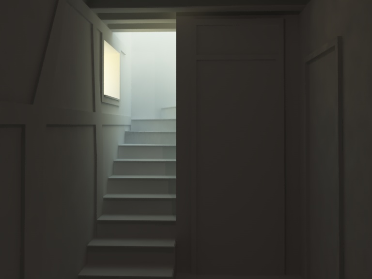 La scena è composta da due luci, una impostata come "sole fisico" che fa entarre la luce dalla finestra e l'altra, interna alla stanza, spot, con intensità di 0.35 e ombre attive.