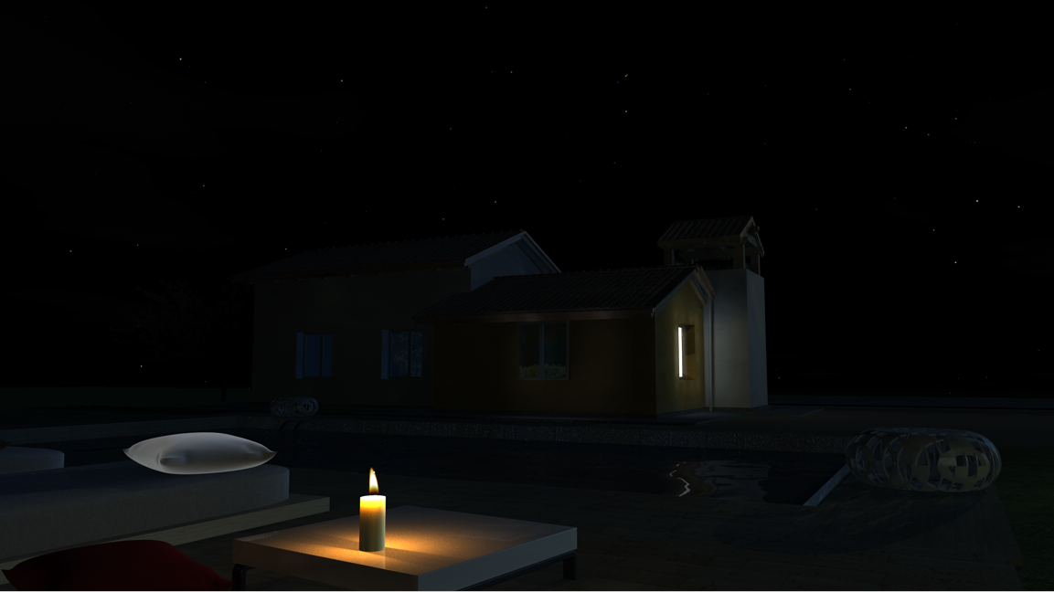 mi piacerebbe inerire una luce che lasci intravedere l'interno, sulla finestra laterale ho inserito un materiale con luminanza al posto del vetro e messo dei globi azzurri molto bassi e mi piace, ho provato ad inserire una luce omni all'interno ma non si vede niente: