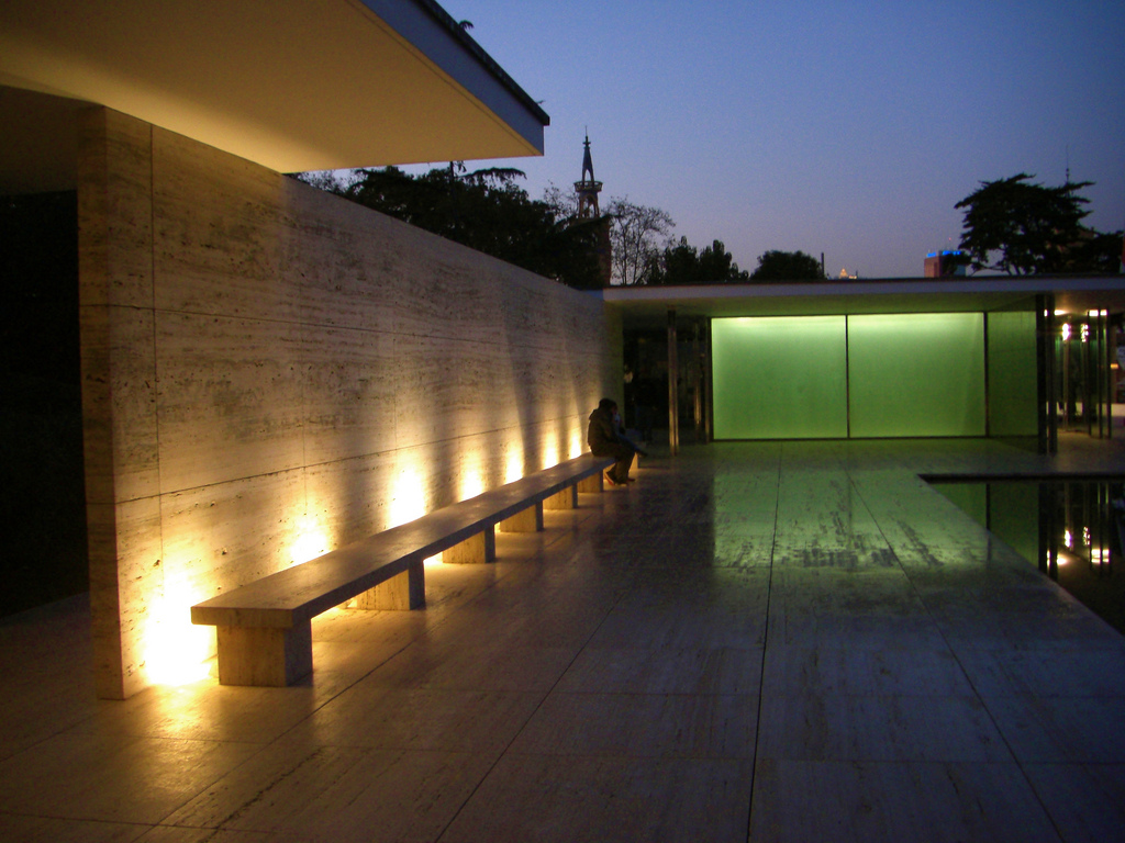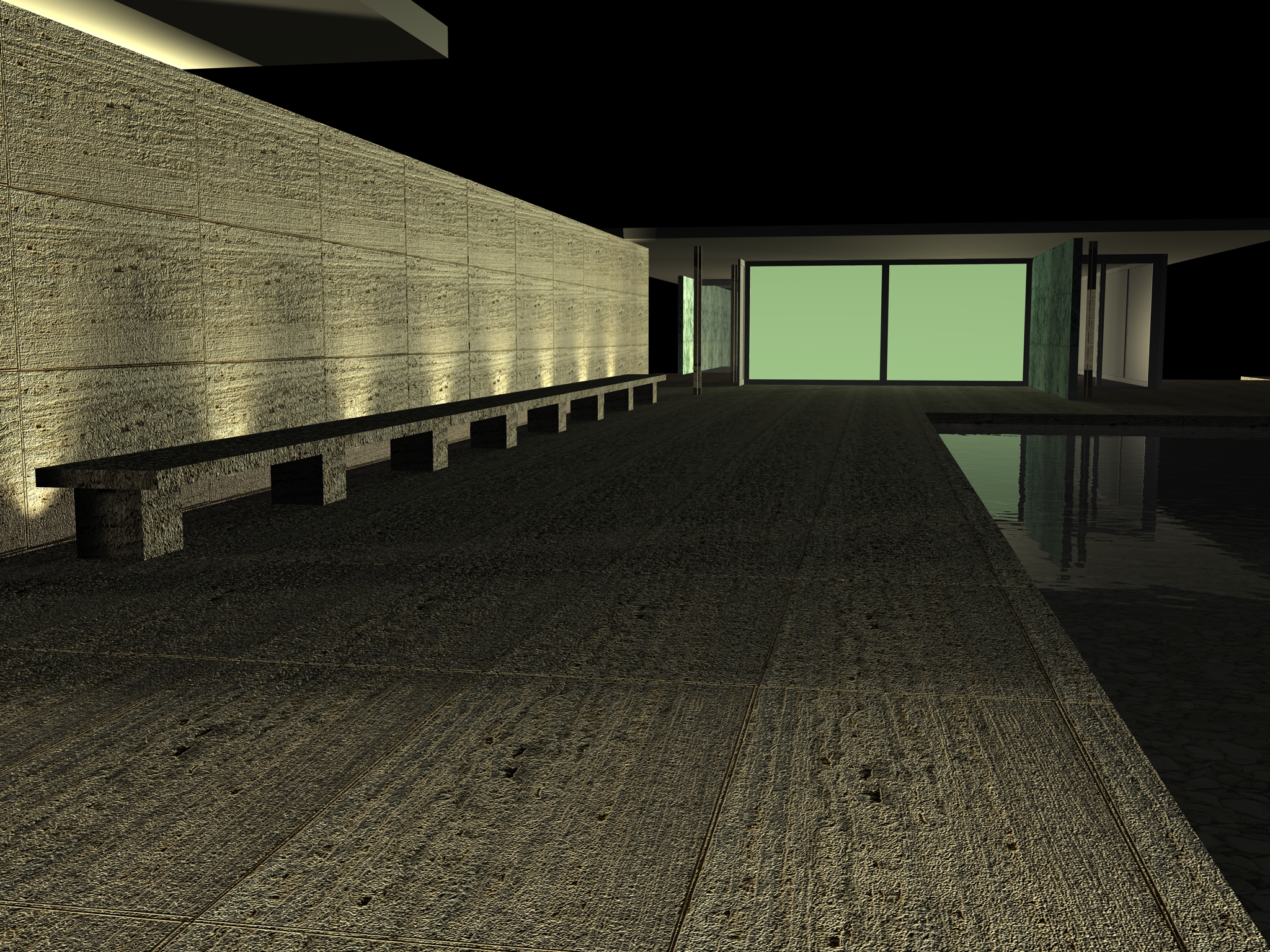 nuovo problemone: ho una doppia parete vetrata (fate conto: vetro-vuoto di 80cm- vetro) del padiglione di Mies Van Der Rohe a Barcellona. Dovrei illuminarla dall'interno in modo che appaia come nella foto che allego, ma nn riesco!!! devo mettere trasparenza al materiale?? devo modificare la luce che metto dentro??