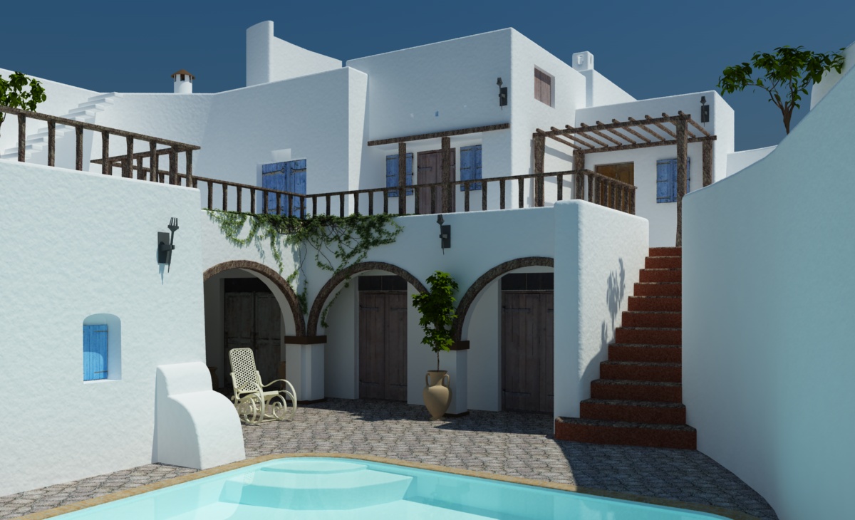 Cmq questa è una prima prova di texture. Non mi convince la tex del pavimento della quale si nota troppo la ripetizione, credo che ne cercherò una migliore. Ho sostituito l'amaca, che non mi piaceva, con la sedia a dondolo, ma anche il suo materiale non mi convince. L'acqua nella foto non ha nessun increspatura, essendo una piscina di modeste dimensioni e parecchio chiusa e riparata dal vento, tuttavia nella mia versione l'acqua risulta troppo piatta, e poco realistica.. non trovate? forse un leggero rilievo ci starebbe bene, ci provo. Anche le porte e le finestre del piano superiore non mi piacciono, devo trovare un modo per renderle in maniera migliore.