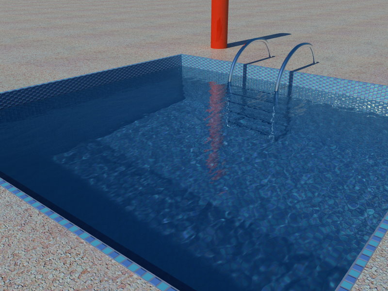 Questa è l'ultima versione dell'immagine con l'acqua leggermente increspata e le texture ritoccate... che ve ne pare? certo con le caustiche sarebbe migliore, ma non riesco a farle funzionare... le attivo dai parametri di rendering di vray ma anche variando i valori non ottengo nessun risultato, anche se vengono calcolate prima di iniziare il render..