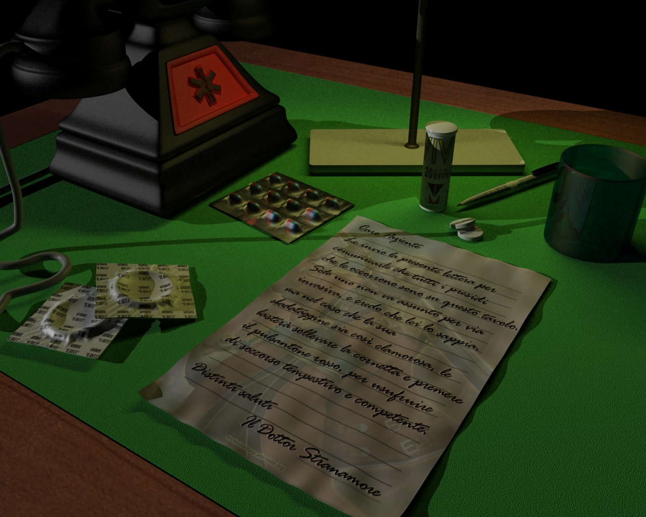 Oggi ho finito una cavolatina hce avevo iniziato a ferragosto..ma dato che ho usato V--Ray l'ho spostata qua.... Che ve ne pare?...non reisco a dare bene i materiali del bicchiere e della scatolina di pillole.