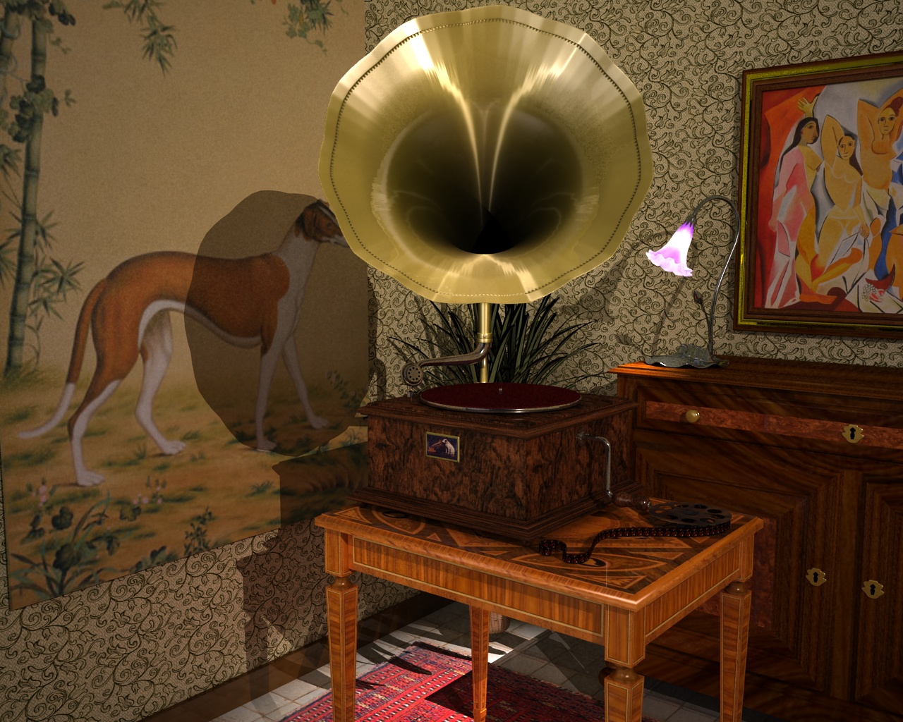 mah veramente nella scena ci sono tre luci, una al centro della stanza ...quella che simula il lampadario, una di lato, e quella che esce dalla tiffany che è uno spot... ma mi rendo conto che lo spot ha una luce troppo bianca e alta ... l'aggiusto.