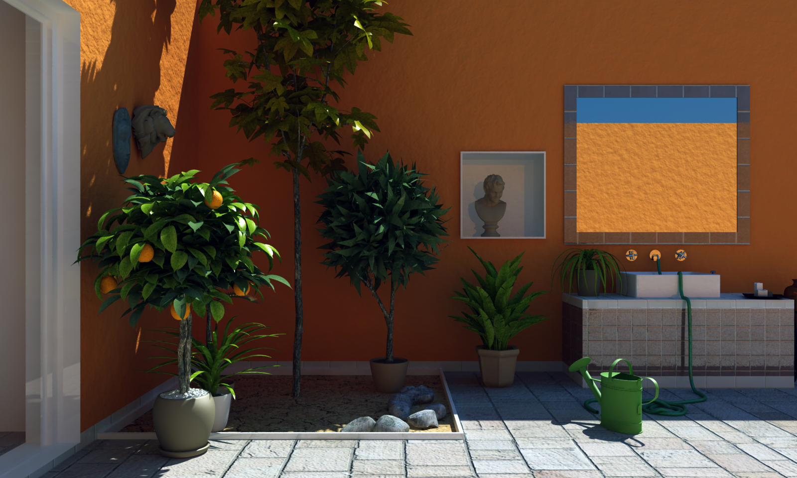 La scena è illuminata con una luce sun+physky con IM = 1, subpixel mapping attivato, hemispheric subd. = 70, phycam con valori di default.