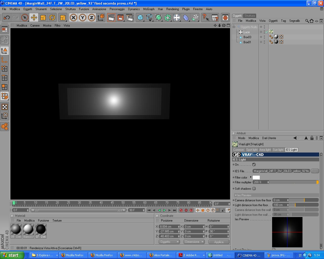 Avrei bisogno del vostro aiuto per una luce che ho scaricato sul sito della Ghidini con relativo file ies. Ora, la luce è piatta e rettangolare e il file yes sembra darmi l'effetto voluto ( come si vede dall' anteprima in basso a destra ) però quando lancio il randering, mi sembra che la luce non dia l'effetto desiderato ossia non si vede un fascia luminosa "rettangolare" ma si vede un punto da cui poi si espande il cono di luce.