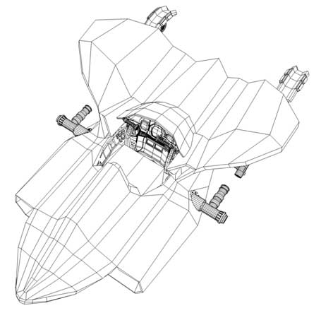 Potresti diminuire la suddivisione del Loft Nurbs per le sp line che hai usato per creare i tubi che collegano la navicella ai reattori...quelli sono neri nel wire
