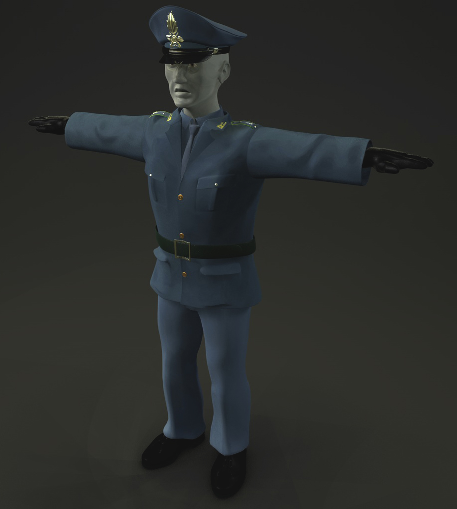 Ci siamo quasi con il finanziere ... le spalline l'hanno alzato di grado, ci sono cintura e scarpe ... manca la cinghia di traverso, la fondina, le pieghe dei pantaloni e lo spessore dei colletti, mancanti perché la giacca è ancora il modello di quando non era ancora nata l'idea del fumetto, con inquadrature ravvicinate annesse, ma era un'unica inquadratura lontana.
