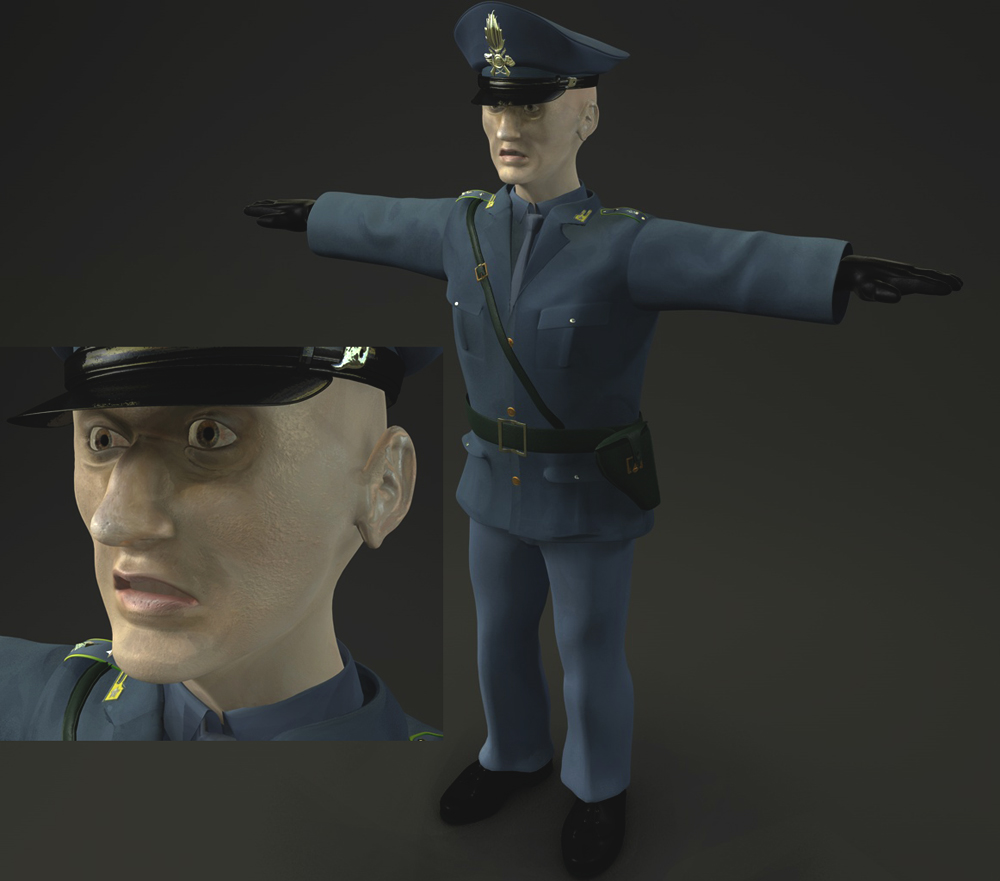 Ora il finanziere è vestito del tutto, nonostante sia ancora intento in alcune prove, come quella per le pieghe, ... la giacca ha una mappa displacement, invece con i pantaloni, anche dopo aver visto in rete cose favolose sul panneggio poligonale,(http://lnx.eklettica.com/coppermine/dis ... t=0&pos=17), sto cercando di lavorare sul modello direttamente, ma con risultati che lasciano ancora aperta la porta del displacement.
