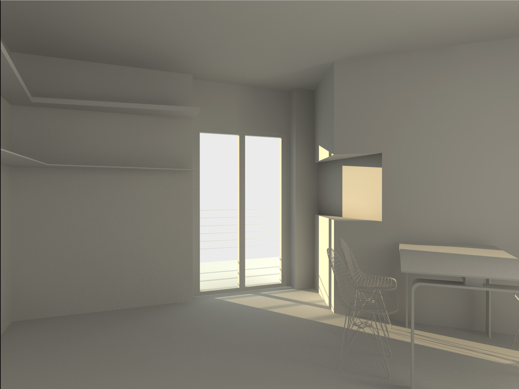 Per quanto mi riguarda potresti provare a spostare la camera, cercando un punto di vista dal quale si vedano con più scorcio prospettico le mensole e la bucatura del muro...